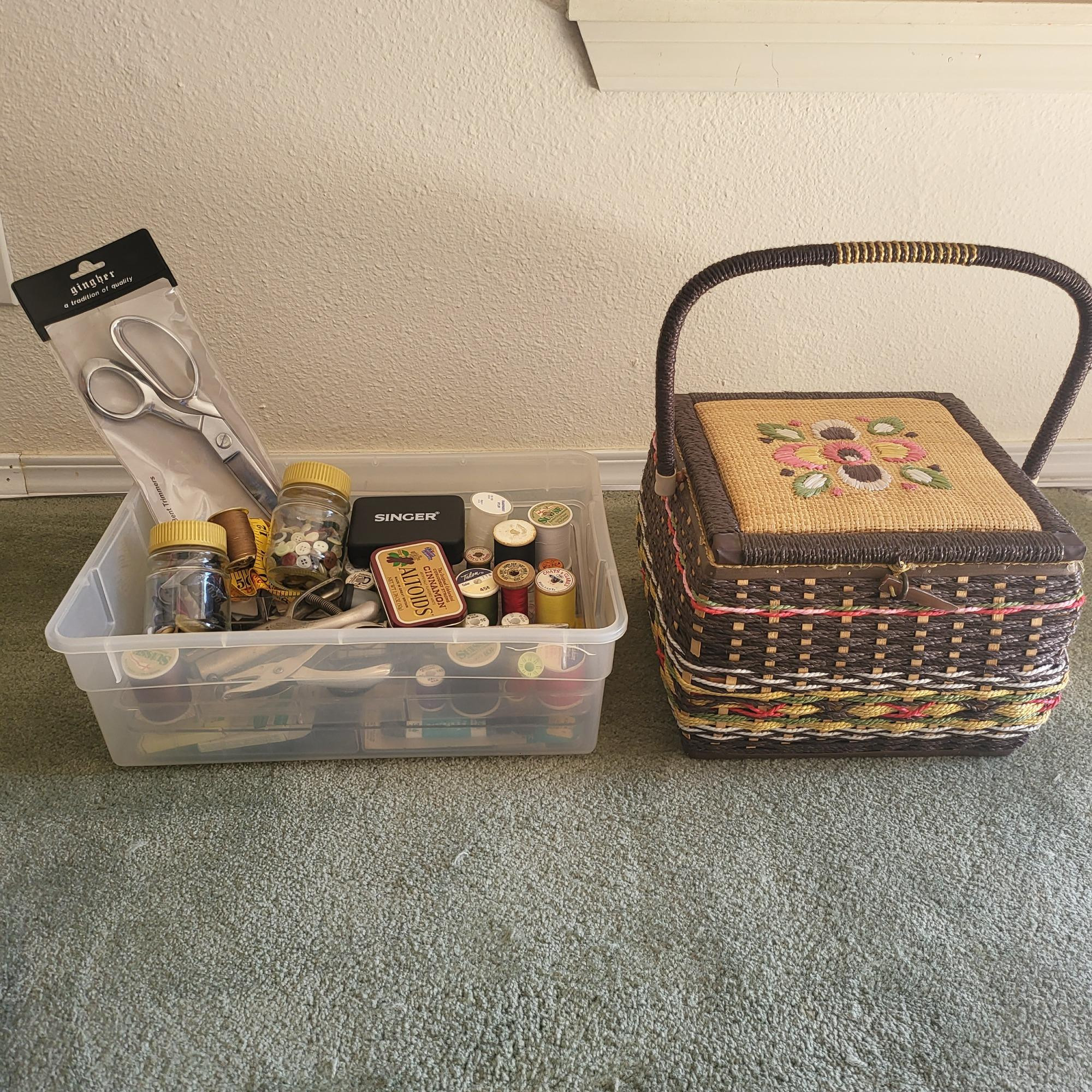 Vintage 1970's wicker lined sewing basket with handle. 10" x 10" x 8". Lidded plastic bin full of sewing notions and other related supplies.
