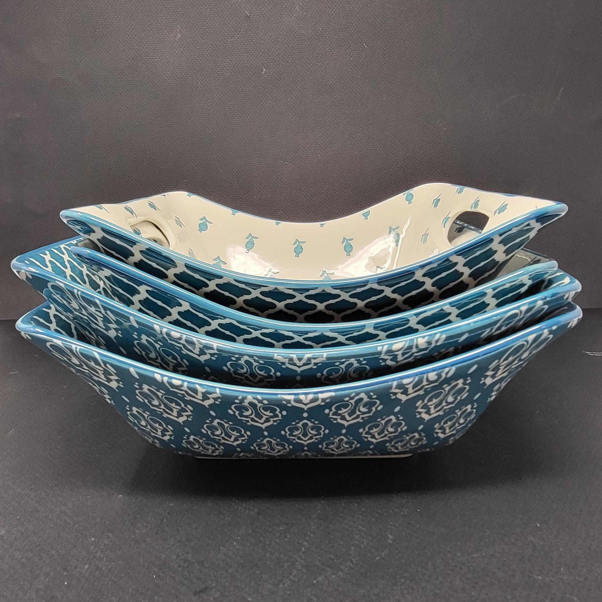 Retired vintage blue/white patterns, Bronson Pinchot, Certified International brand, curved bowls. There are (2) 9" and (2) 8" - these have cutout handles.