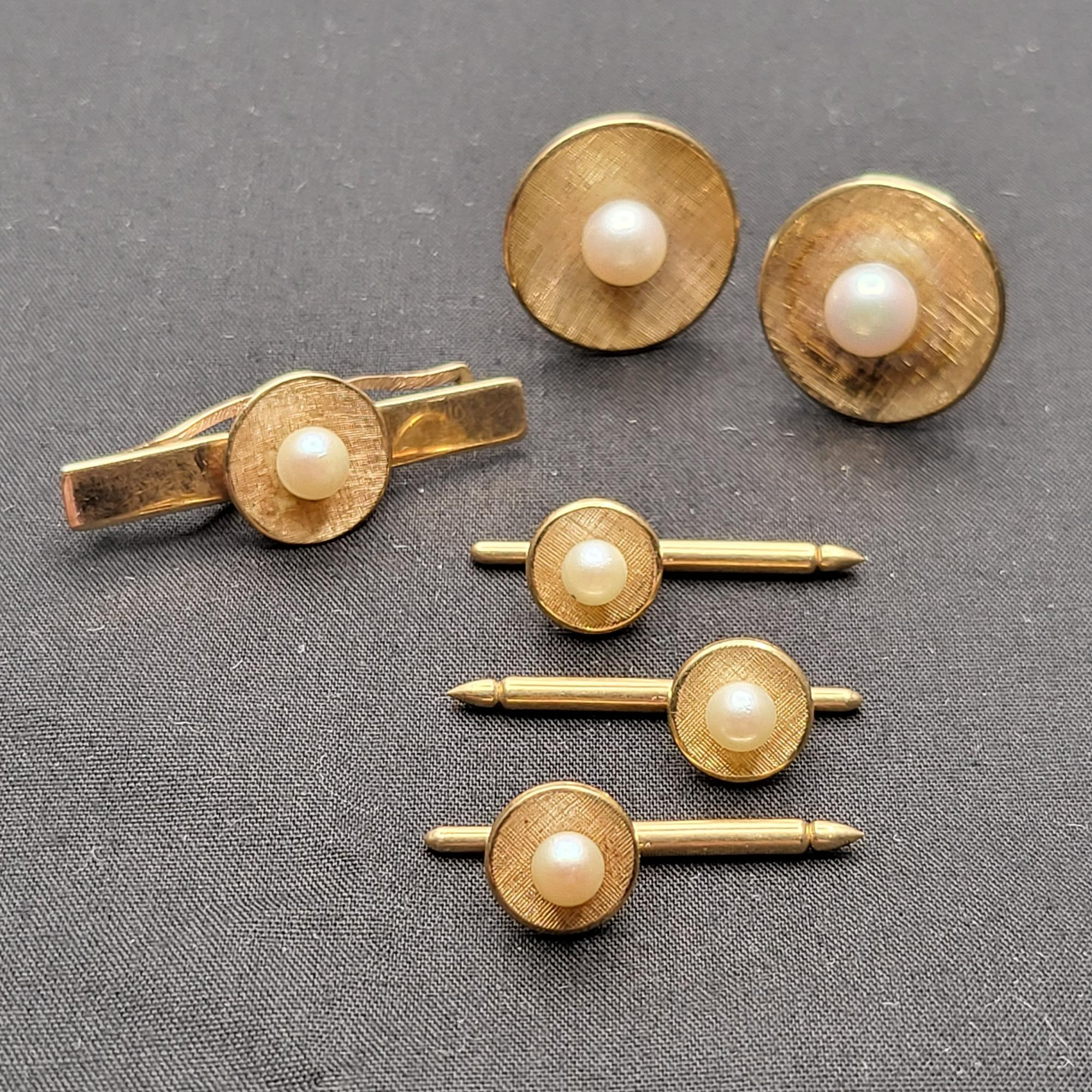 Lot # 90 - 14k Cufflinks, Tie Bar & Tuxedo Button Studs, Genuine Pearls 14.7gr