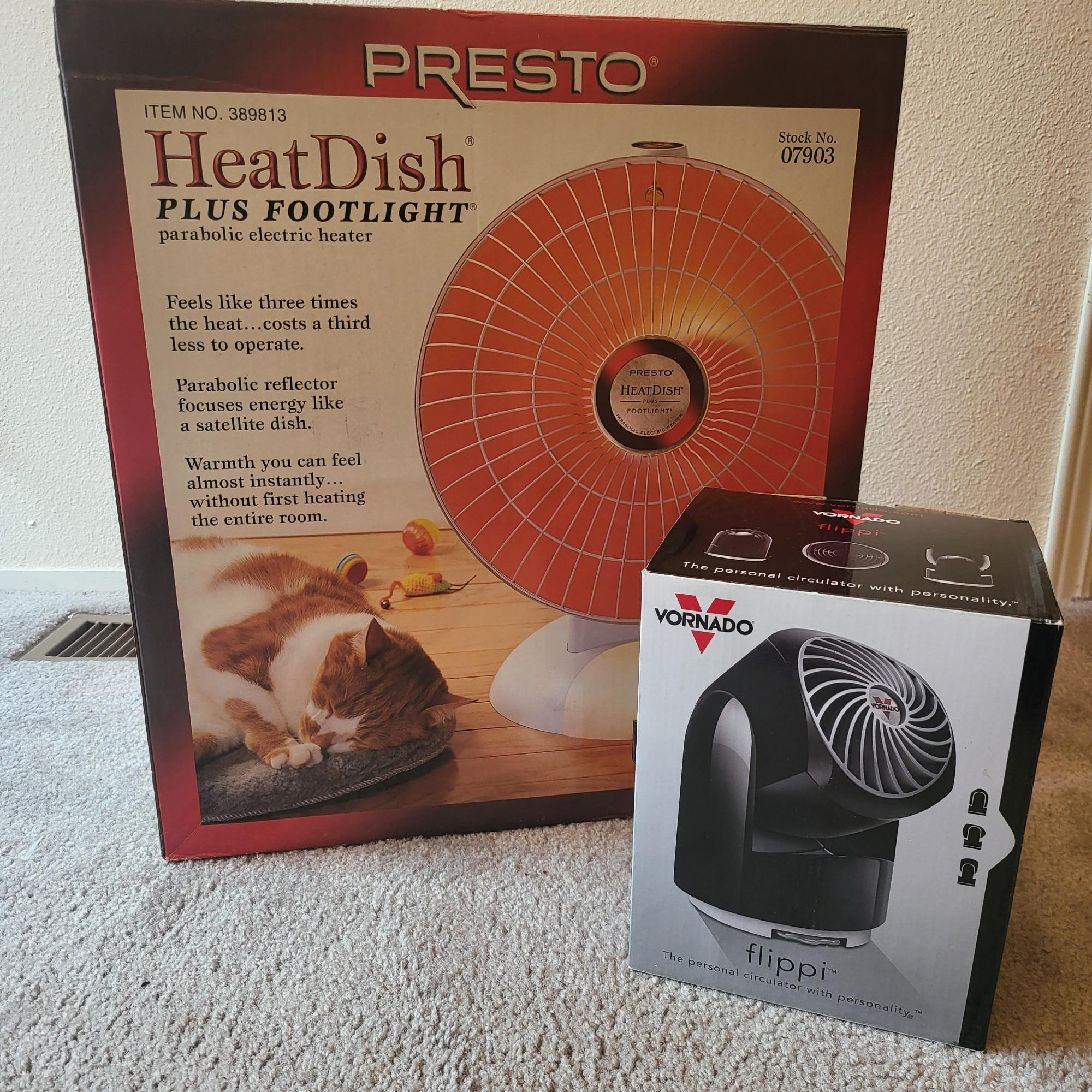 Presto parabolic electric heater dish and Flippi desk/table top air circulator. Sophisticated, Refined, Polished… Flippi™ will definitely increase your cool factor! The lustrous Black complements the modern design. Refreshes your space with 2 speeds and creates a quiet breeze in high-style. Oscillates and flips to direct air where you need it. Uses Vornado’s signature Vortex Technology to move air up to 30 feet! A great desk fan for the office, or use in the kitchen or bedroom. CR1-0095-06