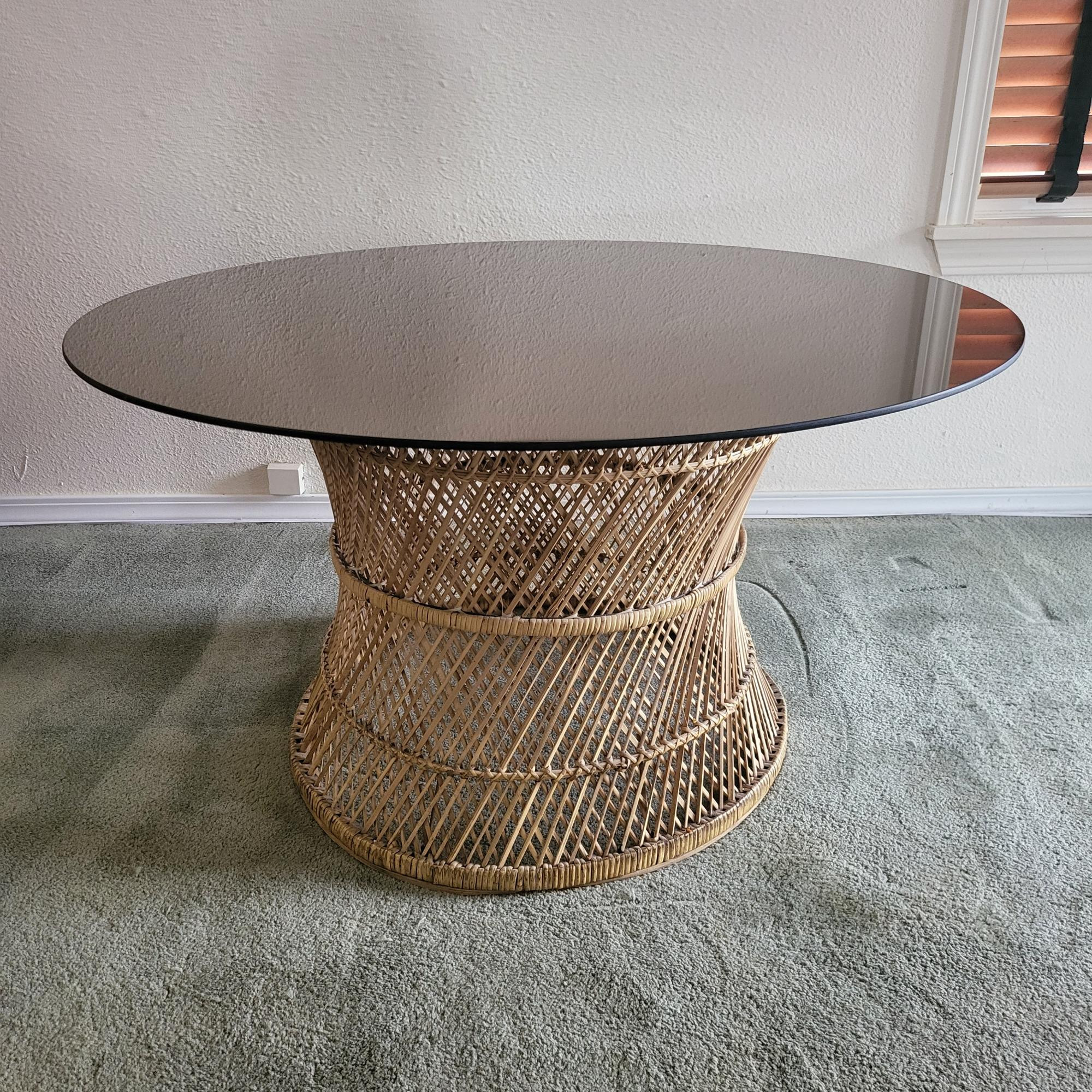 Removable smokey mirrored glass top is 36" diameter. Wicker base is 24.5" W x 20" T.