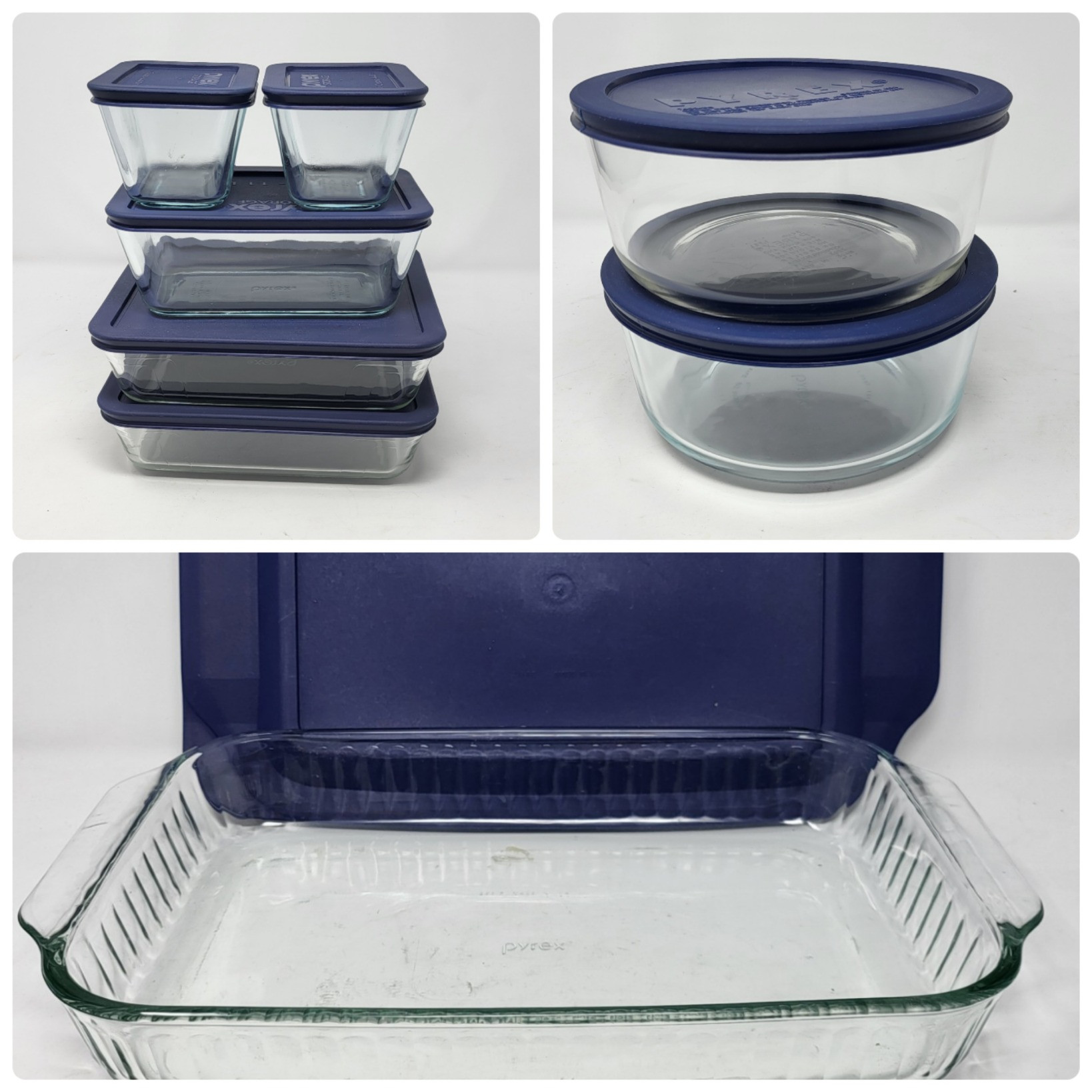 Food friendly glass Pyrex containers in various sizes with plastic covers: