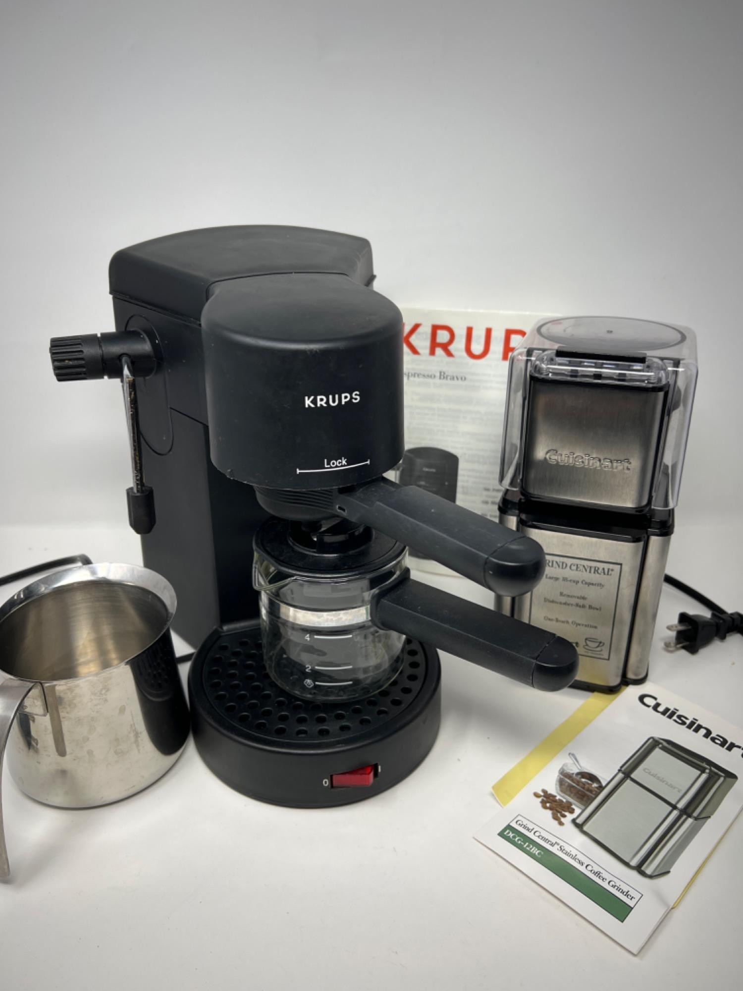 Krups espresso coffee maker with 4 cup carafe and metal frother pitcher and includes manual. Cuisinart coffee grinder with manual. Includes convenient plastic lid to cover and store unused grinded coffee.