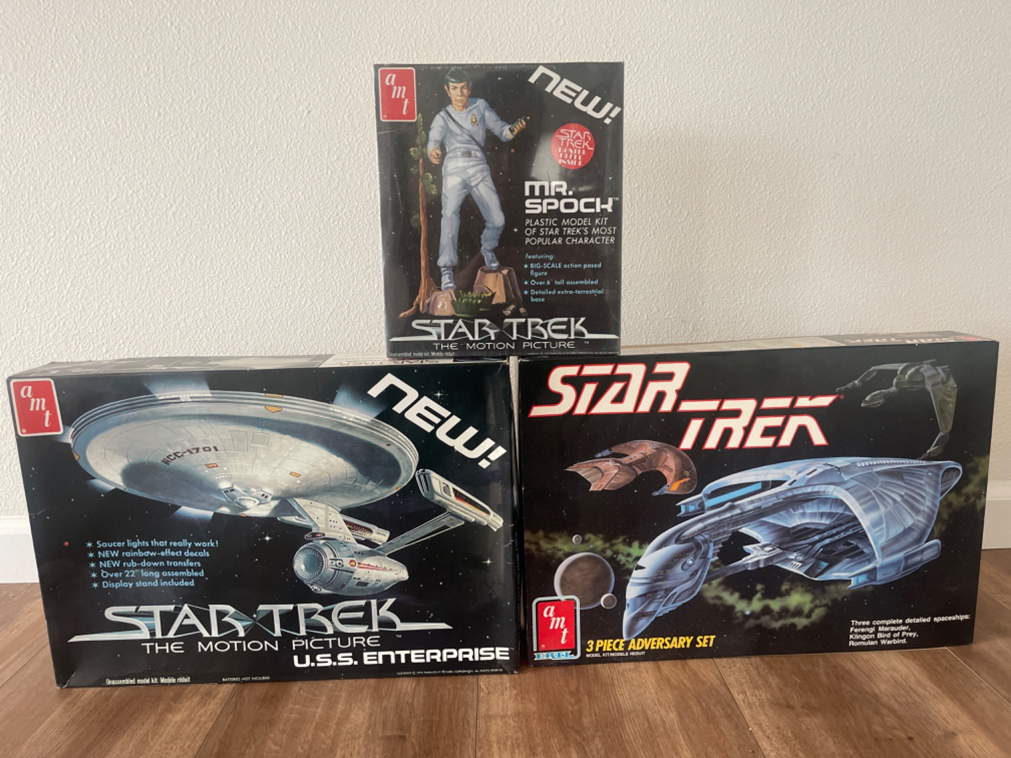 1979 AMT Star Trek Mr. Spock - Has never been opened, but factory seal is broken. 1989 AMT Star Trek - 3 Piece Anniversary Set - Ferengi Marauder - Klingon Bird of Prey - Romulan Warbird - Box is opened, but majority of inner contents remain sealed. 1979 AMT Star Trek The Moon Picture - U.S.S. Enterprise - Box is opened and some contents inside are NOT sealed.