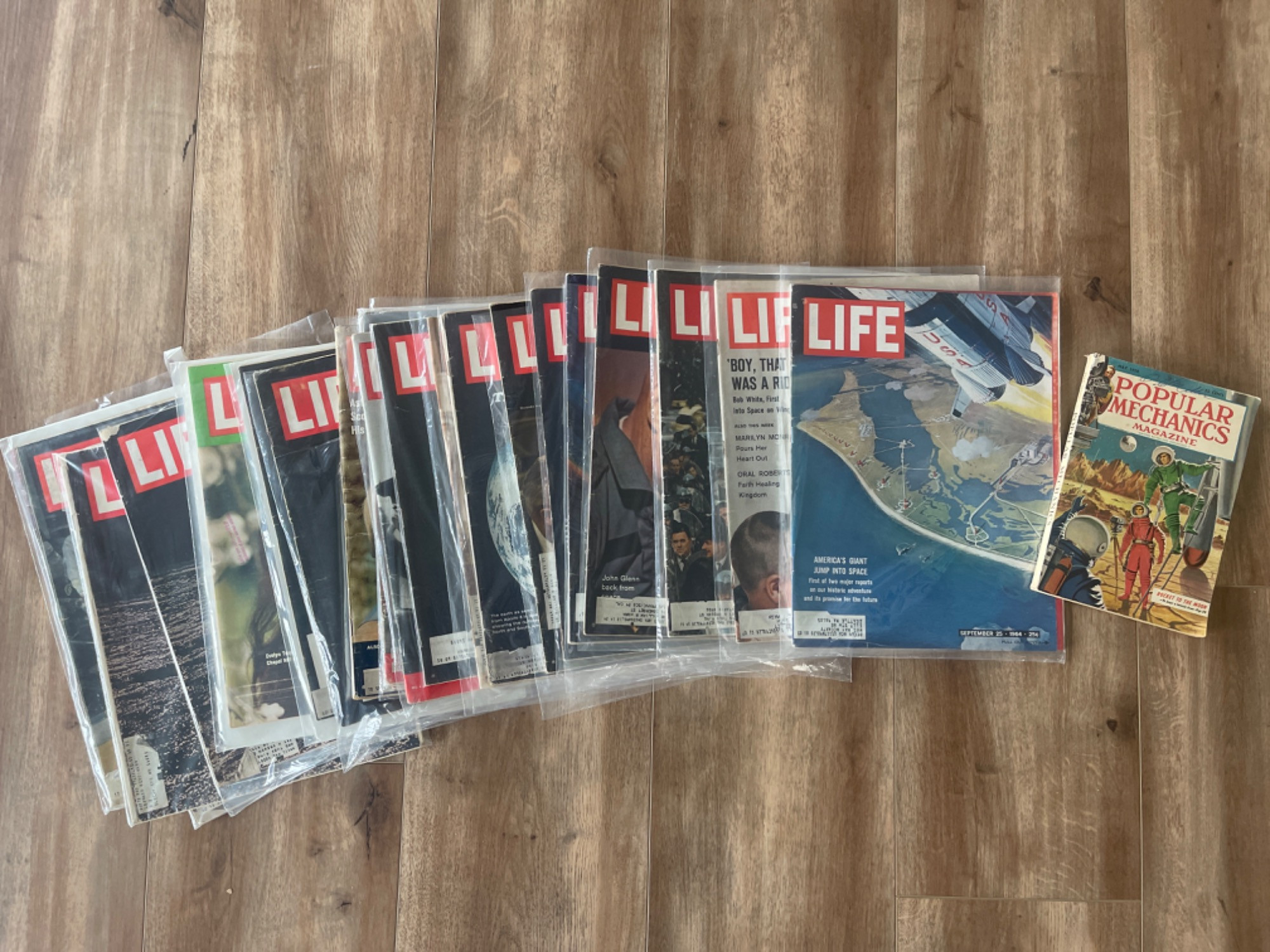 NOT ALL MAGAZINES INCLUDED IN CLOSE UP PHOTOS (21) Life Magazines about NASA & Space, from the1960’s and early 70’s. (1) The Saturday Evening Post dated February 20, 1960 (1) Popular Mechanics Magazine dated May 1950