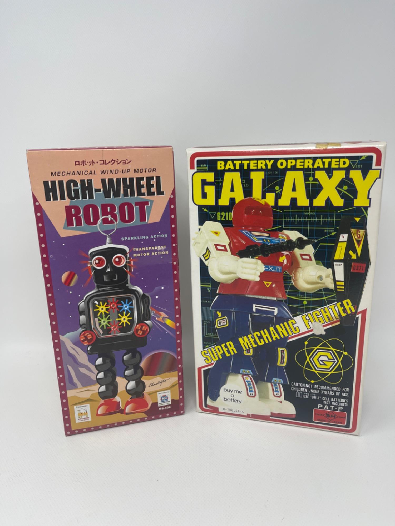 Ha Ha Toys Tin High-Wheel Robot - 10 inches tall - - Open/unused Vintage Battery Operated Galaxy Super Mechanic Fighter - 9.5 inches tall - Open/unused