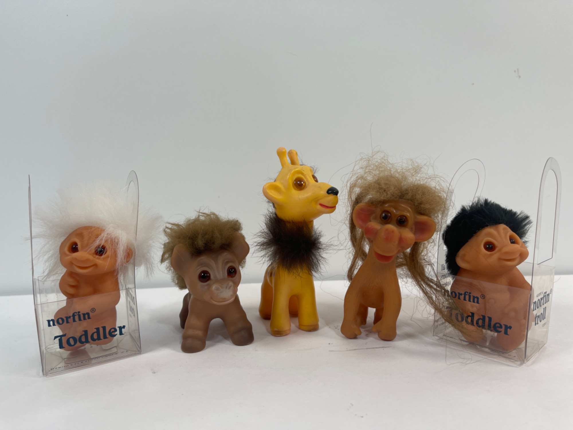 Vintage Trolls - (2) Norfin Toddlers & (3) RARE Dam Things Monkey has dirt in hair Giraffe is missing fur Shortest: 3 inches tall Tallest: 5 inches