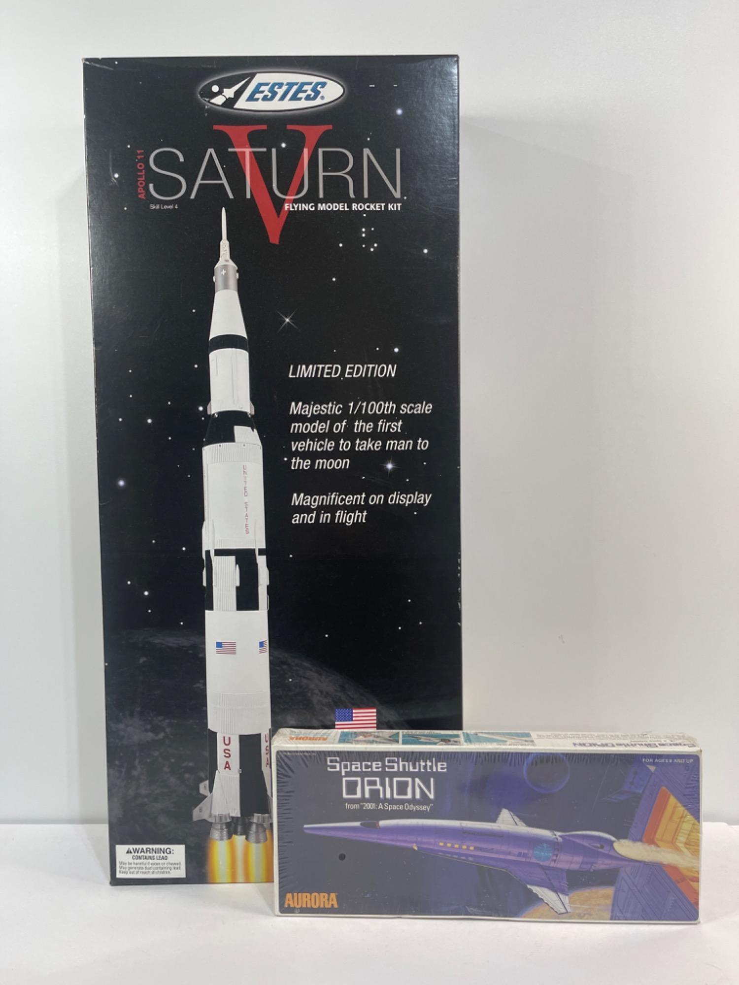 SEALED 1970s Aurora Space Shuttle ORION 2001: A SPACE ODYSSEY Model Kit + Unsure of completeness of Estes Saturn V model kit