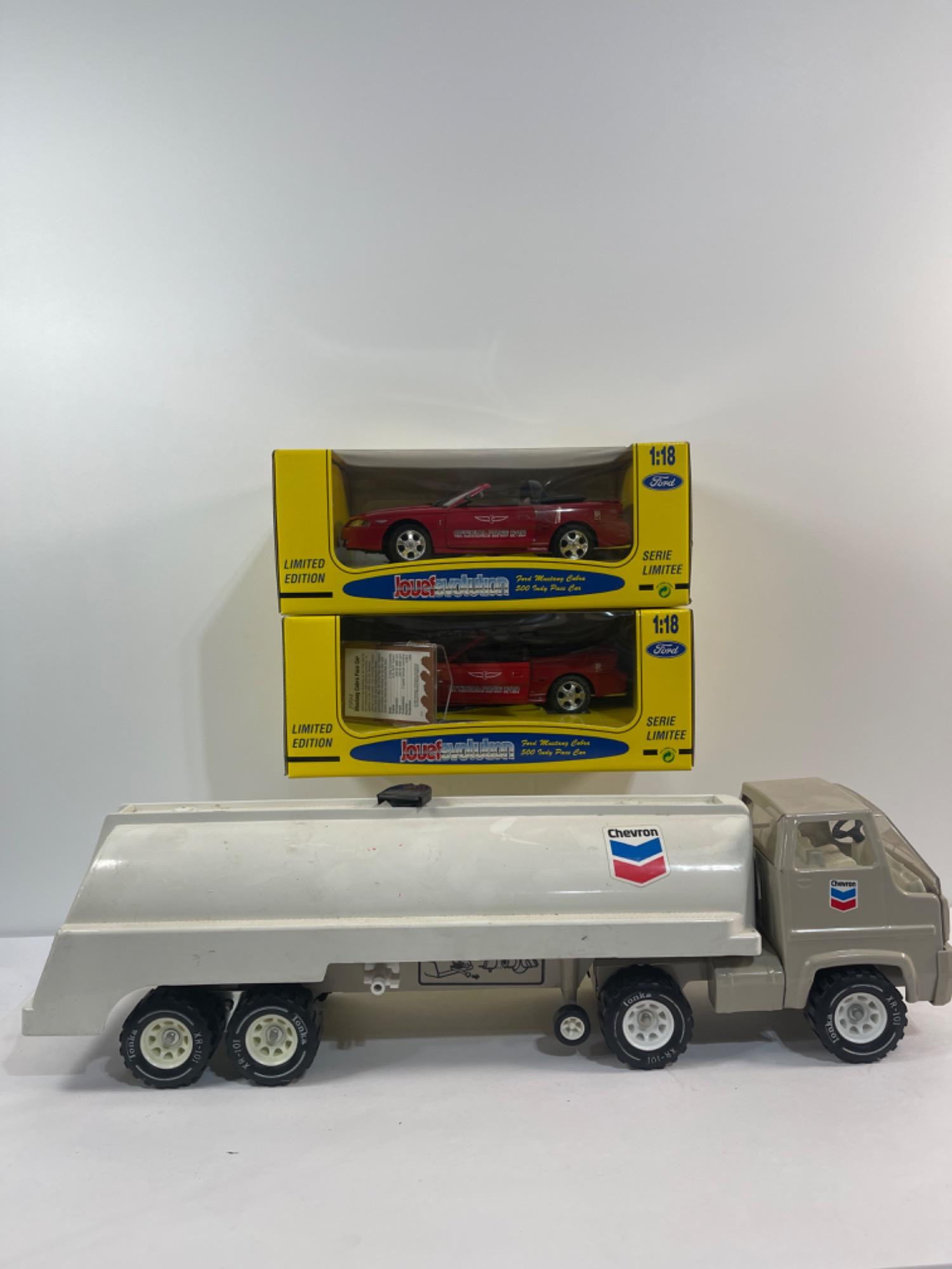 Vintage 1978 Tonka Chevron Semi Truck Trailer Has some scuffs and bumps, overall good vintage condition Measurement when PUT TOGETHER: 25” x 5.5” x 6.5” Also includes (2) Jouef Evolution 1994 Ford Mustang Cobra 1/18 Scale Car - One appears SEALED, the other opened and displayed. Both have their boxes.