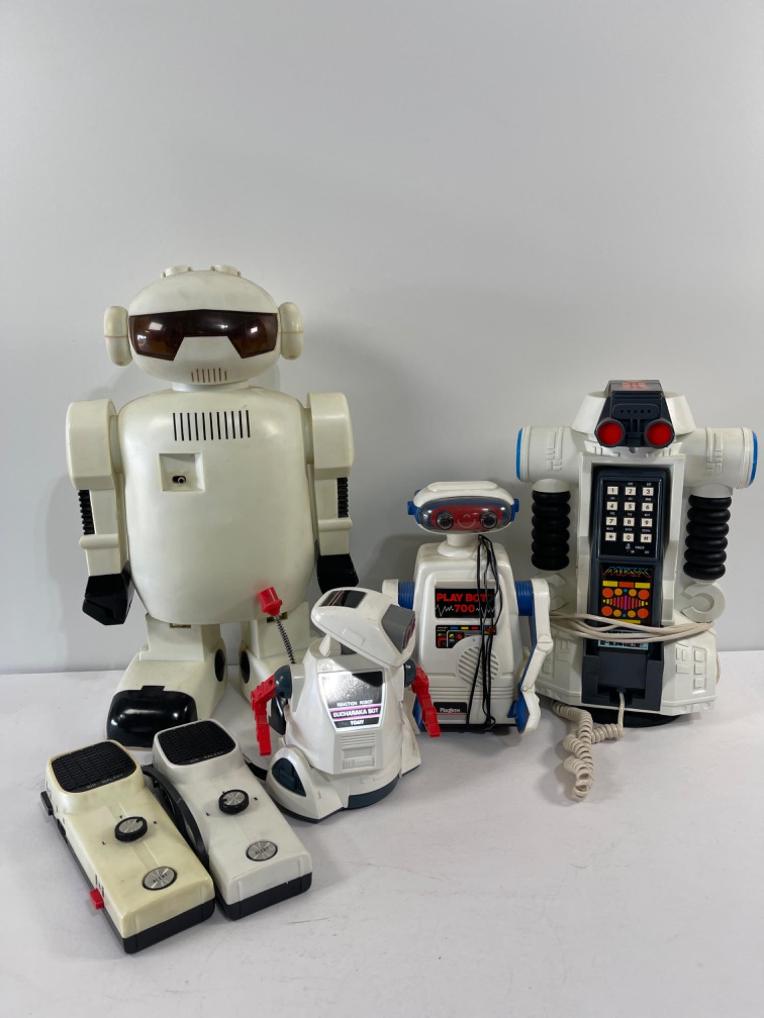 1979 Mattel Sir Galaxy Robot with 2 Radio Controls Play Bot 700 Vintage Tomy Sucharaka Bot Reaction Robot Vintage Robo Force Telephone Robot Shortest: 6 inches Tallest: 16 inches All are UNTESTED
