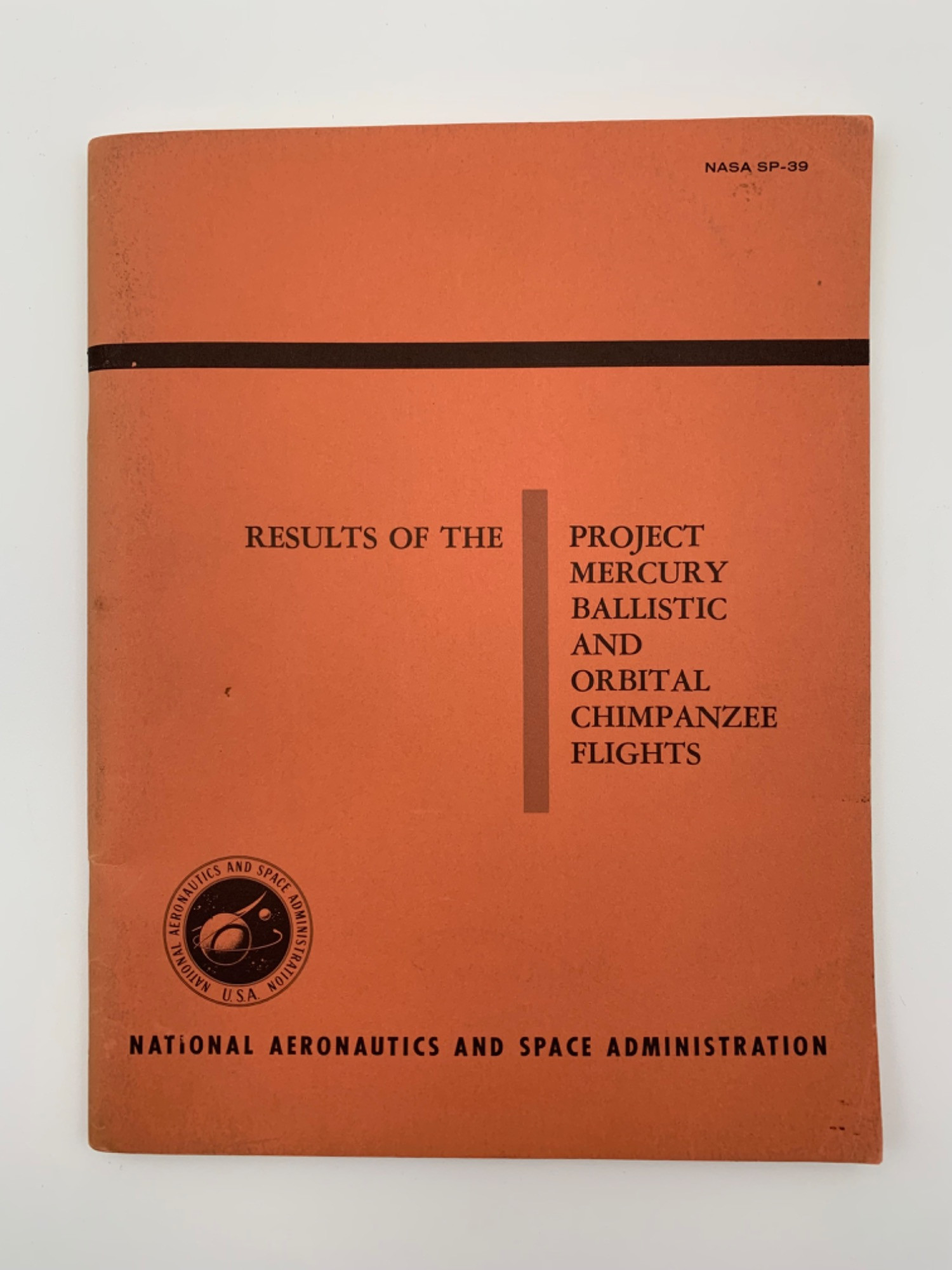 RESULTS OF PROJECT MERCURY'S BALLISTIC & ORBITAL CHIMPANZEE FLIGHTS from NASA. Softcover. 1963, NASA SP-39 (Washington, DC). Original publication containing technical information on preparation and logistics for NASA's chimpanzee program along with resulting summaries. Chimpanzees Ham (Mercury Redstone) & Enos (Mercury Atlas) experienced sub-orbital/orbital flight before subsequent flights by Alan Shepard and John Glenn. Booklet is in excellent condition for its age - cover is intact with little wear, very light fading of orange-pink cover paper at spine, and there is no writing in the booklet. Total of 71 pages. Measures 10.25" H x 7.75" W.