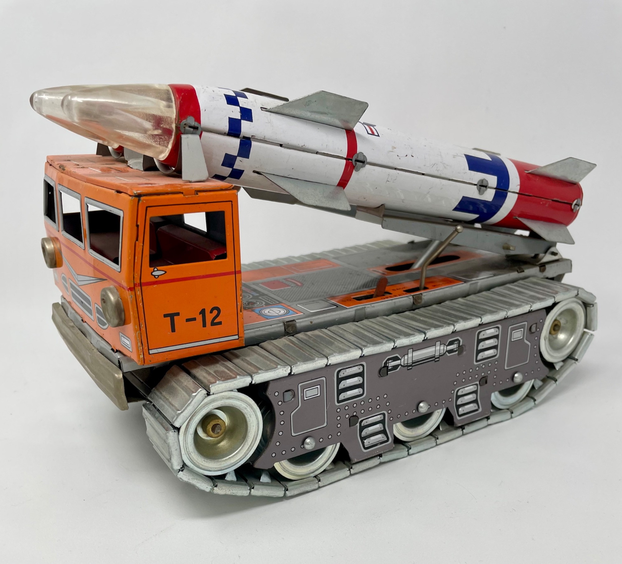 Toy rocket transport and launch vehicle from Japanese manufacturer Daiya, circa 1965. Tracked rocket launch vehicle of tin plate featuring caterpillar tracks, with orange cab. Carries two red, white, and blue USAF Titan & Saturn rockets. Cab is marked "T-12". Battery-operated. Very rare! Shows wear commensurate with age - please see photos. Not tested/unsure if features work. Measures 6" H x 6" W x 9.75" L Note: this is one of the featured robots on the poster in Lot #68. Shipping available only through Fed Ex Pack & Ship