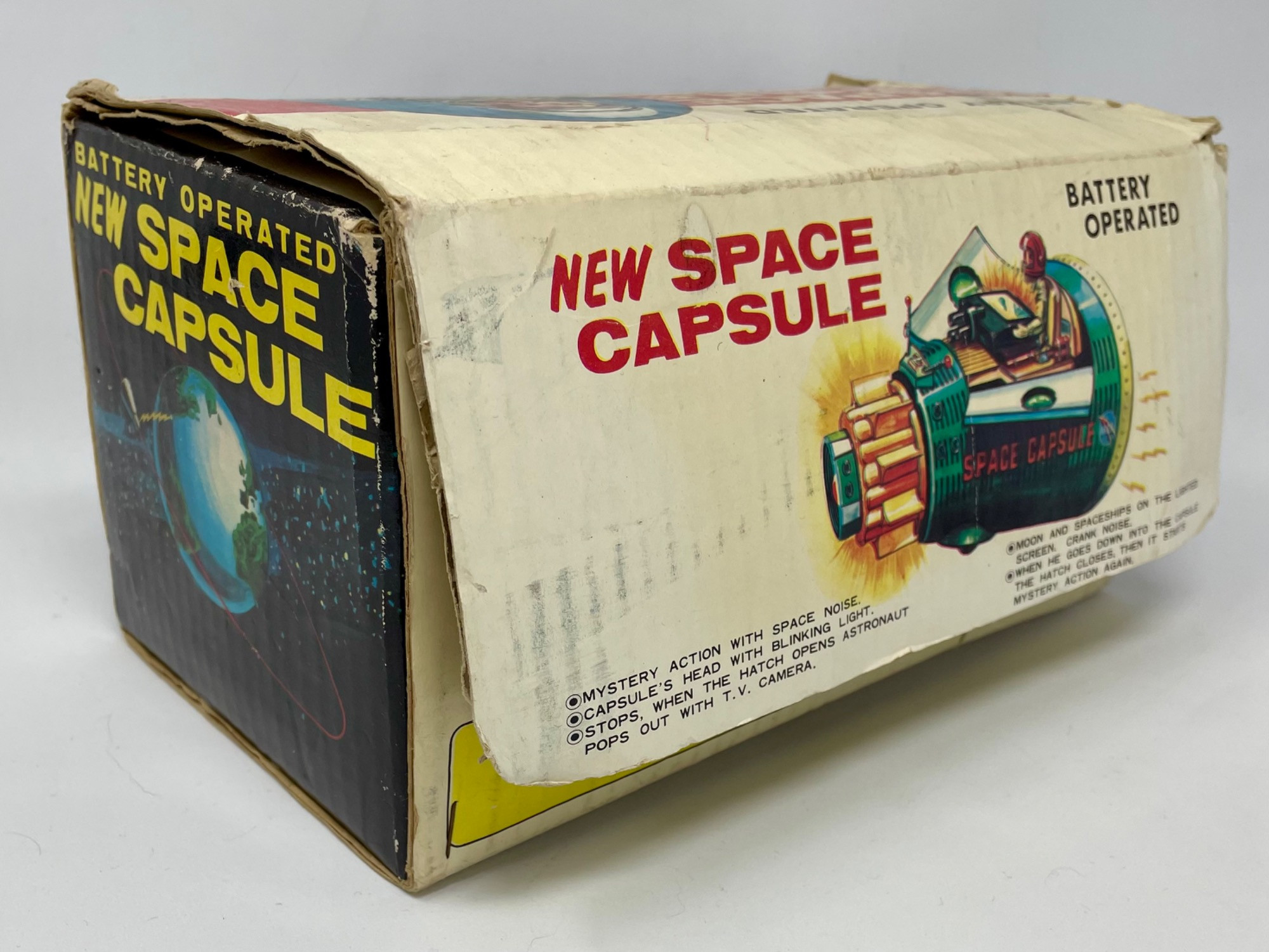 Tin plate battery-operated ‘New Space Capsule’ from Japanese manufacturer SH Horikawa. Complete with astronaut holding television camera within the capsule. TV screen is missing, but lightbulb is intact. In very good overall cosmetic condition. Functionally untested. Original box is in fair condition with very noticeable age wear. Measures 9.5"H x 5.5" W x 5.5" D . Shipping available only through Fed Ex Pack & Ship