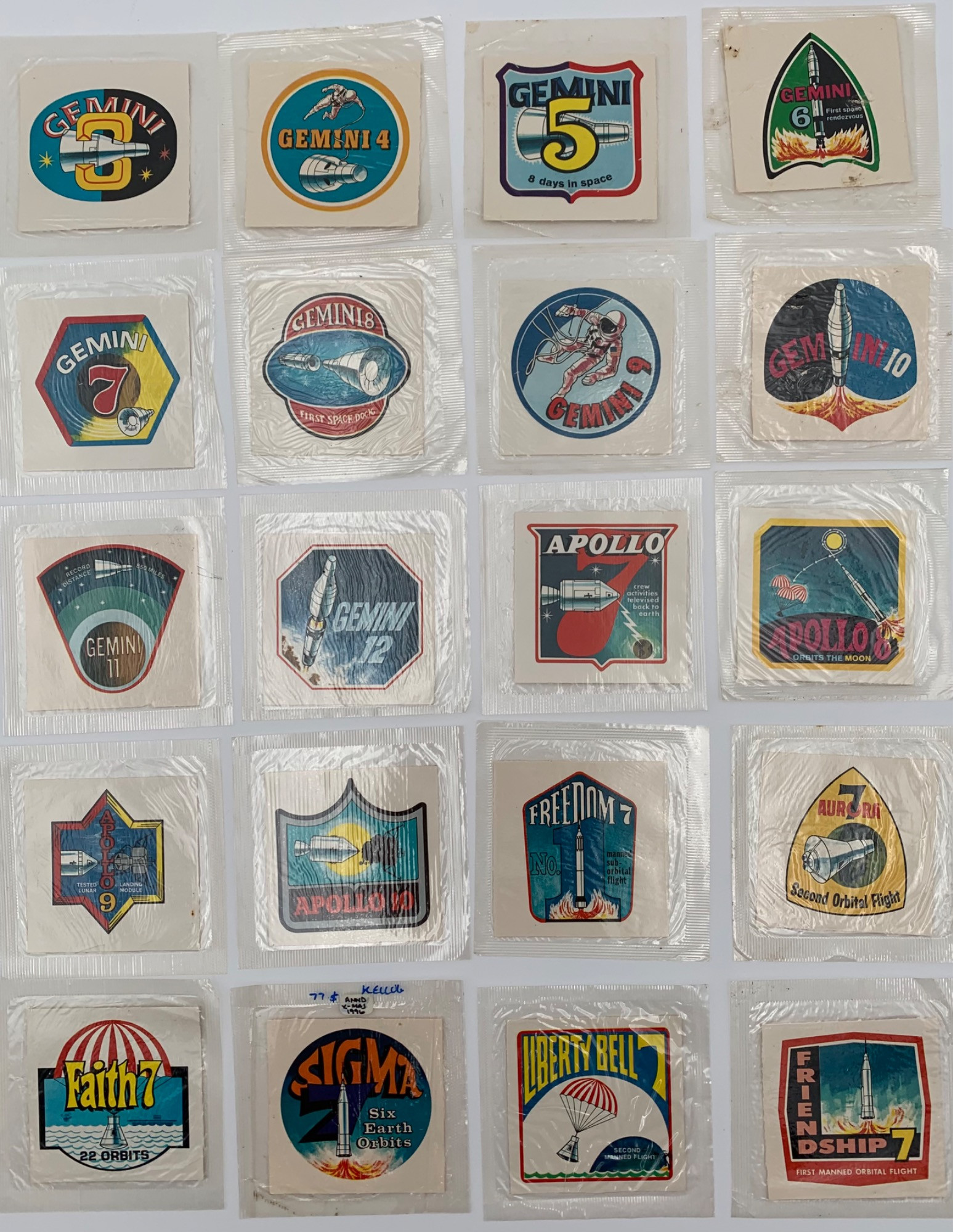 Complete set of Kellogg's NASA Program Space Stickers - a premium award in the 1960s. Logo of mission is on front with info on astronauts and the mission itself on verso. All are in original sealed plastic wrap and in very good condition with two exceptions: Gemini 10 has sustained some slight folding/splitting damage and Sigma 7's plastic was opened allowing for discoloration on the reverse - please see last two photos. Very rare to find a complete set - you will usually see singles or pairs for sale. Measure 2.5" square