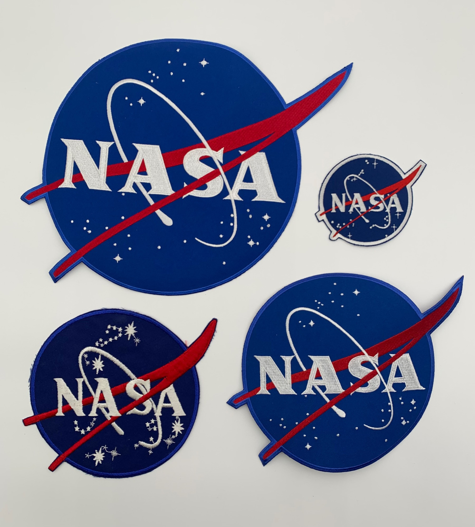 4 NASA insignia patches; one quite large.. Three of the patches are new with iron-on adhesive. The fourth has been used, but is still in great shape. We would suggest sewing all on for greater durability. They measure as follows: 15.25" longest red swoosh - just shy 11" circle diameter 11" longest red swoosh - 8" circle diameter 9" longest red swoosh - 7" circle diameter (older patch) 5" longest red swoosh - just shy 4" circle diameter