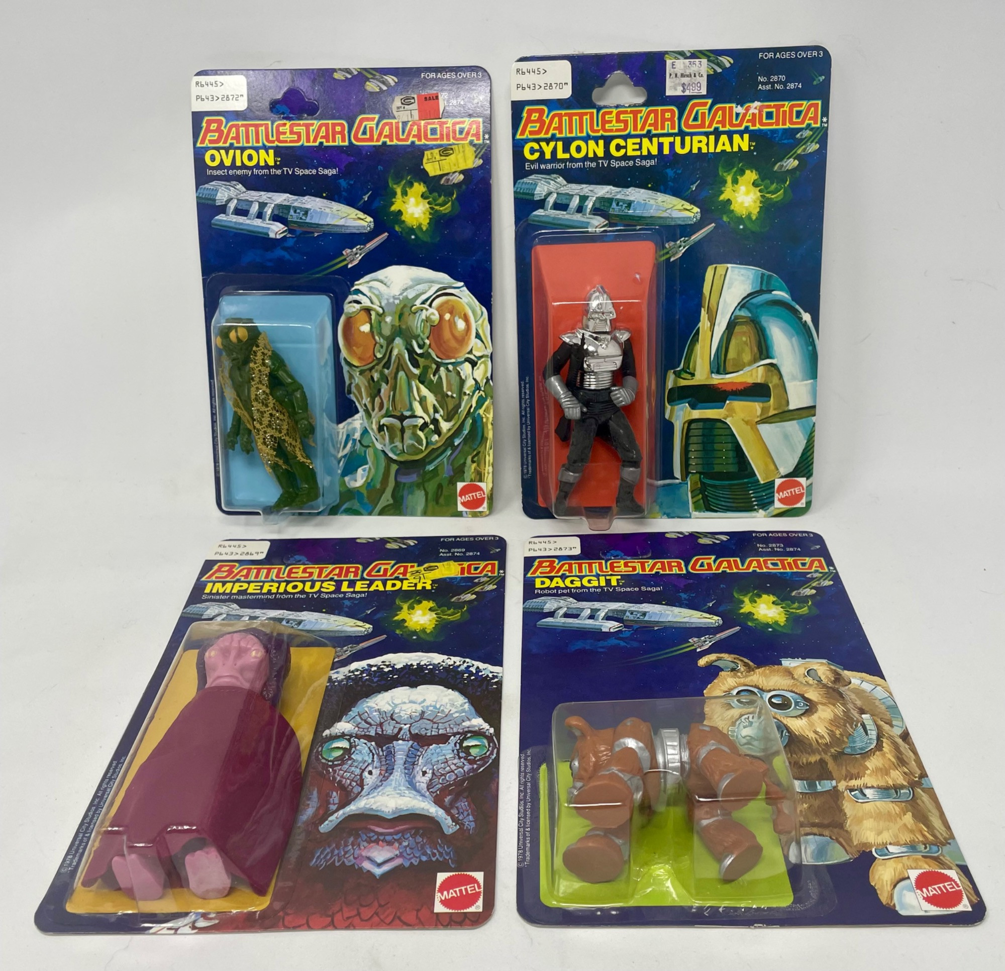 Set of 4 original Battle Star Galactica action figures from 1970s TV series starring Lorne Green and Dirk Benedict. Authorized by Universal Studios for manufacture by Mattel. 1978. Figures are 3" H. All are in their original packaging with seals intact less a slight bit of storage wear and slight white bloom on some areas. Please see photos for details. Daggit ("Robot Pet") Model #2873 Ovion (“Insect Enemy”) Model #2872 Cylon Centurion ("Evil Warrior") Model #2870 Imperious Leader (“Sinister Mastermind”) Model #2869 Shipping available only through Fed Ex Pack & Ship