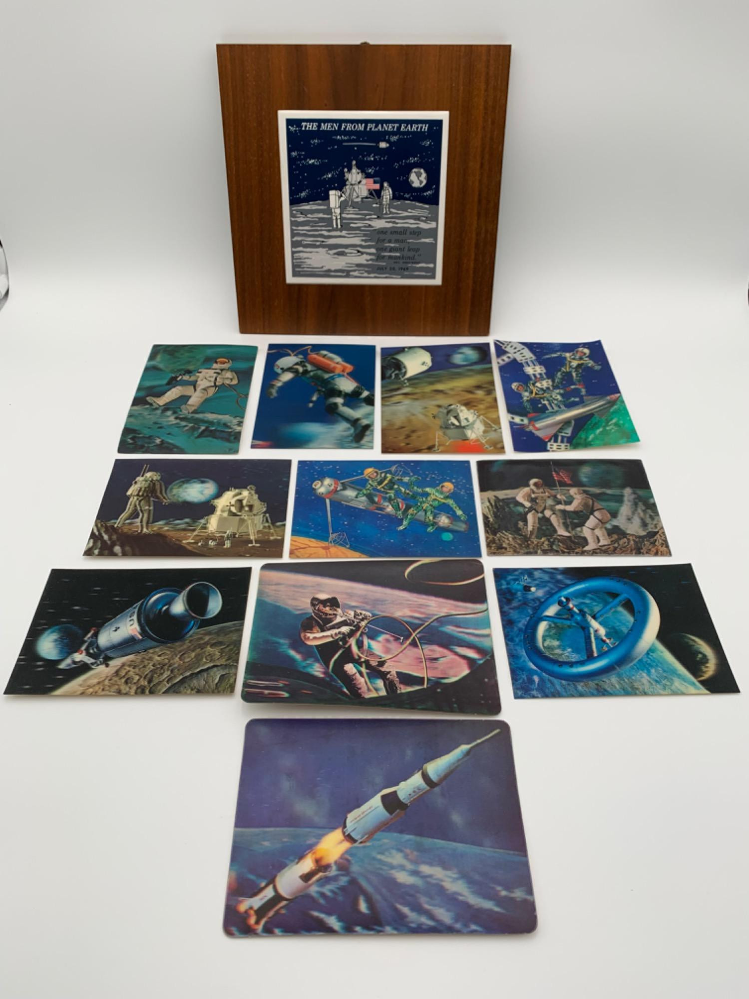 Ceramic tile framed with medium-tone wood & Masonite - could be used as a wall-hanging or hefty enough to serve as a trivet. Hanger on reverse as well as pad for tabletop use. Tile measures 6" square, frame measures 10" square. In excellent vintage shape from 1969. 11 vintage 3-D space/astronaut postcards from the late 1960s/early 1970s. All are unused; one has space stamp cancelled at Cape Canaveral for Apollo 13. Most printed in Japan.