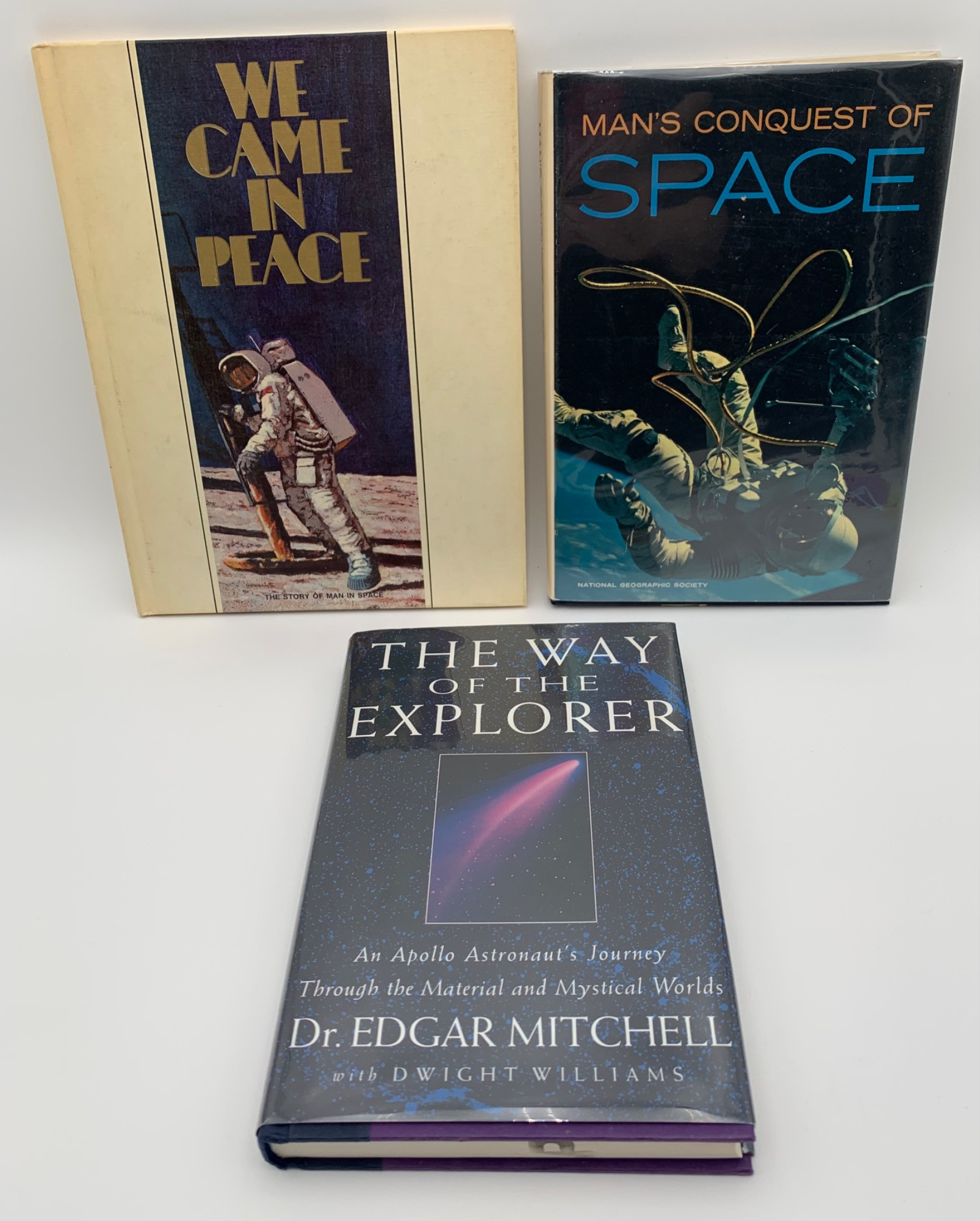 Trio of books - one signed by Apollo 14 astronaut Ed Mitchell. THE WAY OF THE EXPLORER by Edgar Mitchell and Dwight Williams. Signed on title page by Edgar Mitchell - Apollo 14 astronaut. Hardcover with dustcover/plastic jacket protector. 1996, Putnam & Sons (New York NY). 230 pages. Excellent condition except for a small ink transfer on bottom of page block; see last photo. MAN'S CONQUEST OF SPACE by William R. Shelton. Hardcover with dustcover/plastic jacket protector. 1968, National Geographic (Washington DC). Great color photos just like you'd expect from Nat Geo. 200 pages. Good condition. WE CAME IN PEACE - THE STORY OF MAN IN SPACE - LeRoi Smith, ed. Hardcover. 1969, Classic Press (San Rafael CA). 77 pages. Good used condition. Please look at all pictures to judge books' condition for yourself.