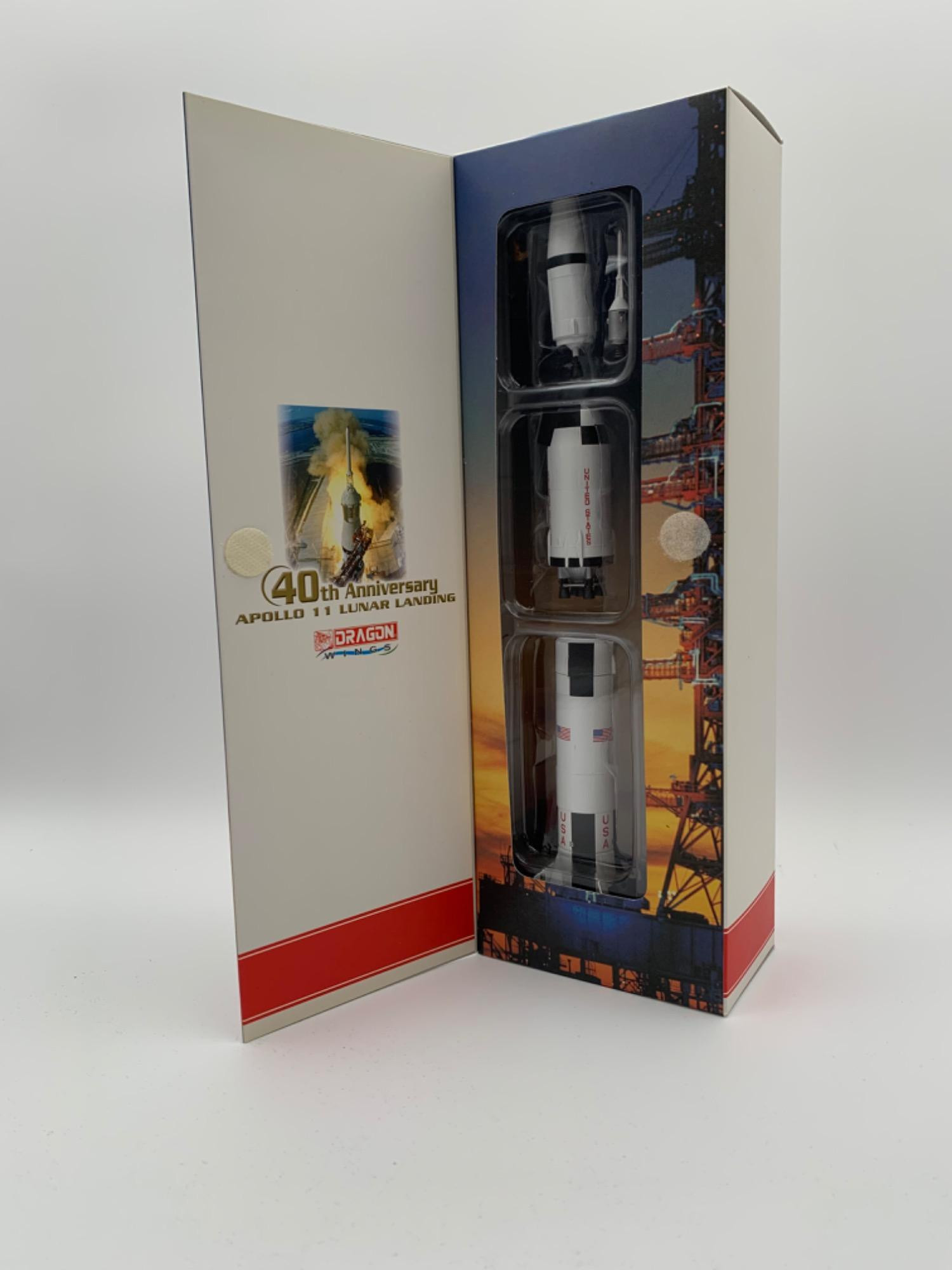 The 40th anniversary of Apollo 11's lunar landing is celebrated in this special edition detailed model from Dragon Wings of Hong Kong. This separate stage model was produced in 2009 and has a 1:400 scale. Model #56111. Box has been opened, but we believe it was for a visual check rather than assembly & and display as pieces don't appear to have been moved. Approximately 12" H when put together. Shipping available only through Fed Ex Pack & Ship