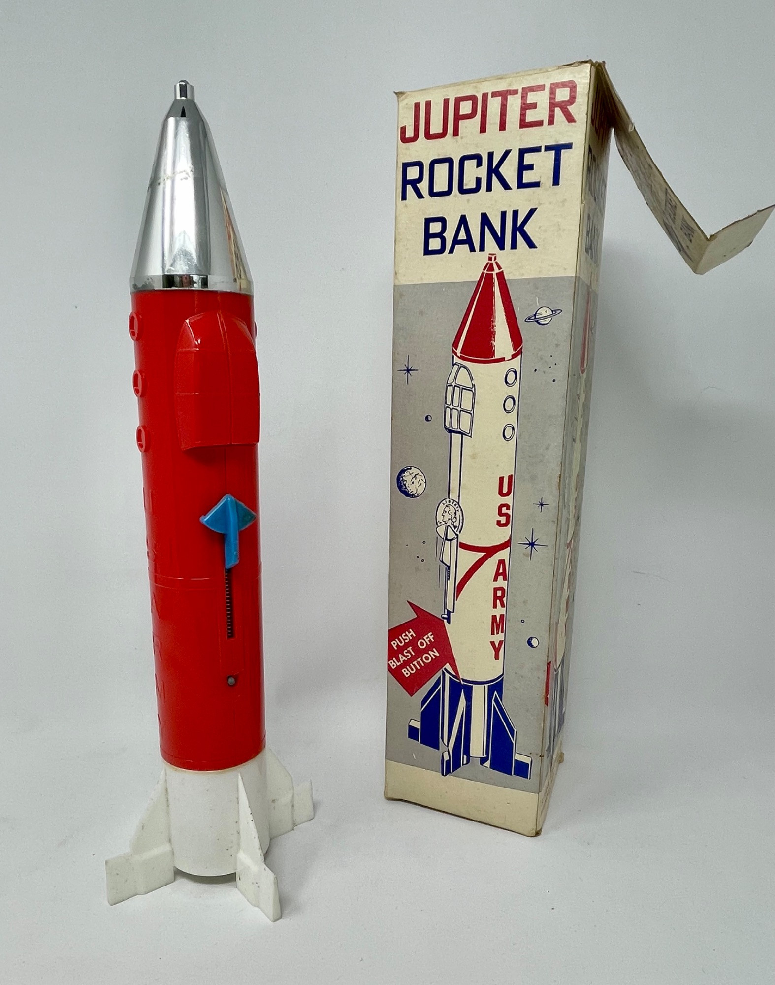 1960s Jupiter Rocket Bank from Superior Toy & MFG Co. of Chicago. Red plastic rocket with silver metal nose cone.. Removeable disk at bottom to retrieve coins. US Army logo on side of rocket. Small crack to base and a few spots of discoloration in plastic/wear to metal cone, but it works great! Measures 13.5" H. Comes with original box in used condition. See photos for details on condition. Shipping available only through Fed Ex Pack & Ship