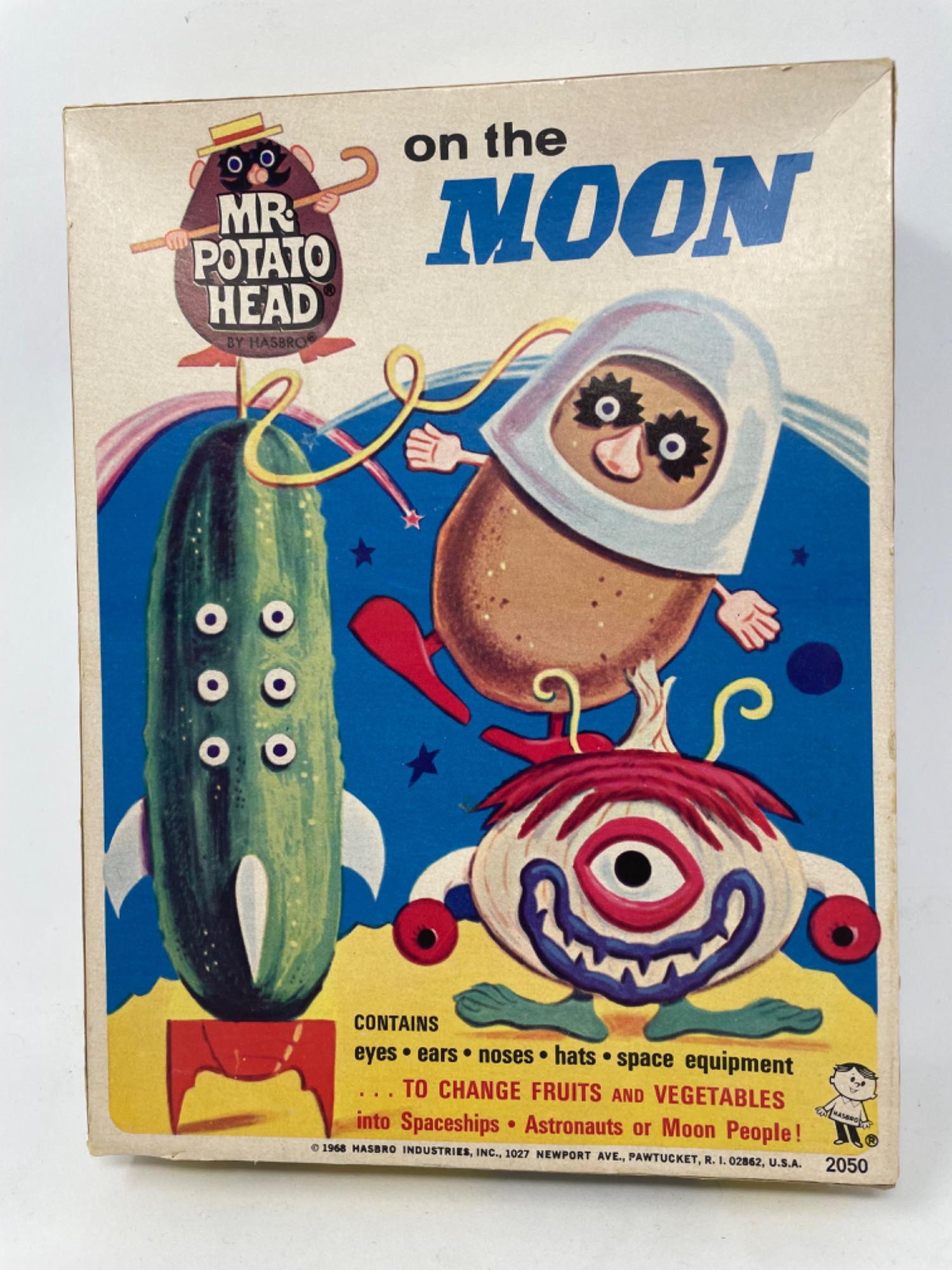 Incredibly rare 1968 Mr. Potato Head on the Moon vintage space toy kit in its original box. Appears to be complete with all components. Hasbro, 1968. This kit was designed to use on vegetables, so you will not see a plastic potato, onion, or cucumber as you stick the pieces into REAL vegetables. This is a Holy Grail of a toy designed to promote the great space race to the moon in 1969. Plastic bags, manual, and pamphlets - it's all there! Pieces are in great shape although the box is a bit worse for wear on its corners. See photos for details. Shipping available only through Fed Ex Pack & Ship