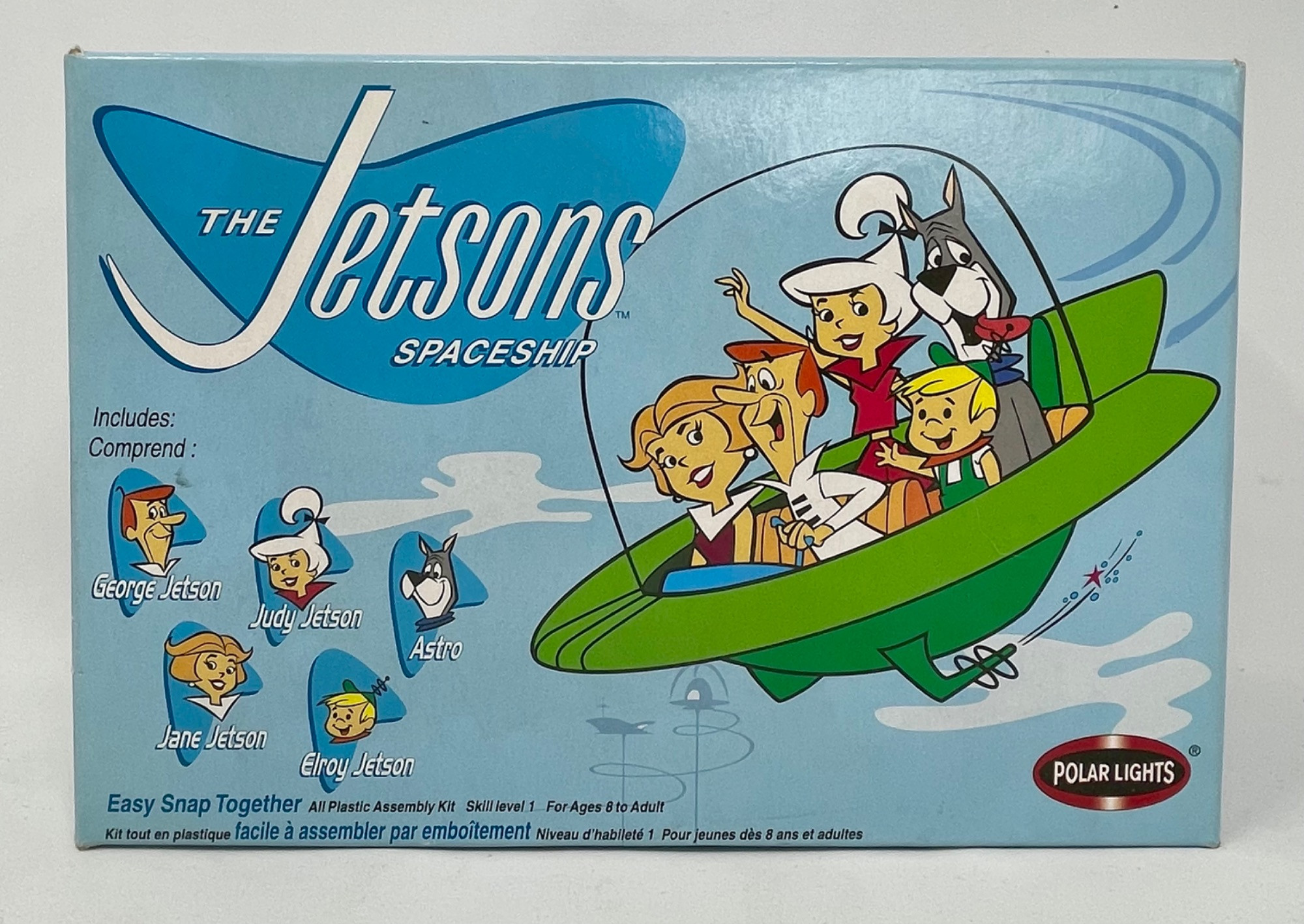 "Meet George Jetson!" Thanks to Polar Lights you can own your own Jetsons space car! 2001. Box has been opened, but all parts appear to be present and still in original sealed packaging. Snap-together plastic kit of the Jetson Family with George, Astro, Elroy, Judy, and Jane along with their wonderful green glass dome space car.