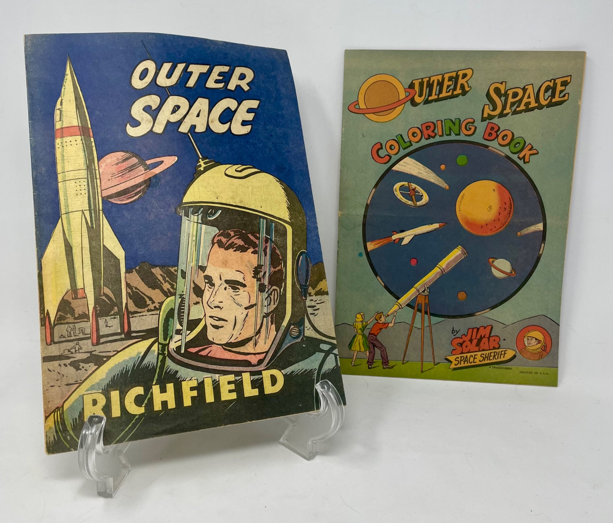 Space Age "Outer Space" 1966 coloring book from Wm. C. Popper & Co. of New York. Paired with an "Outer Space" (1953 Richfield) promotional comic book distributed by the Arco Oil Co. Both in great, unmarked and uncolored condition - and rare!