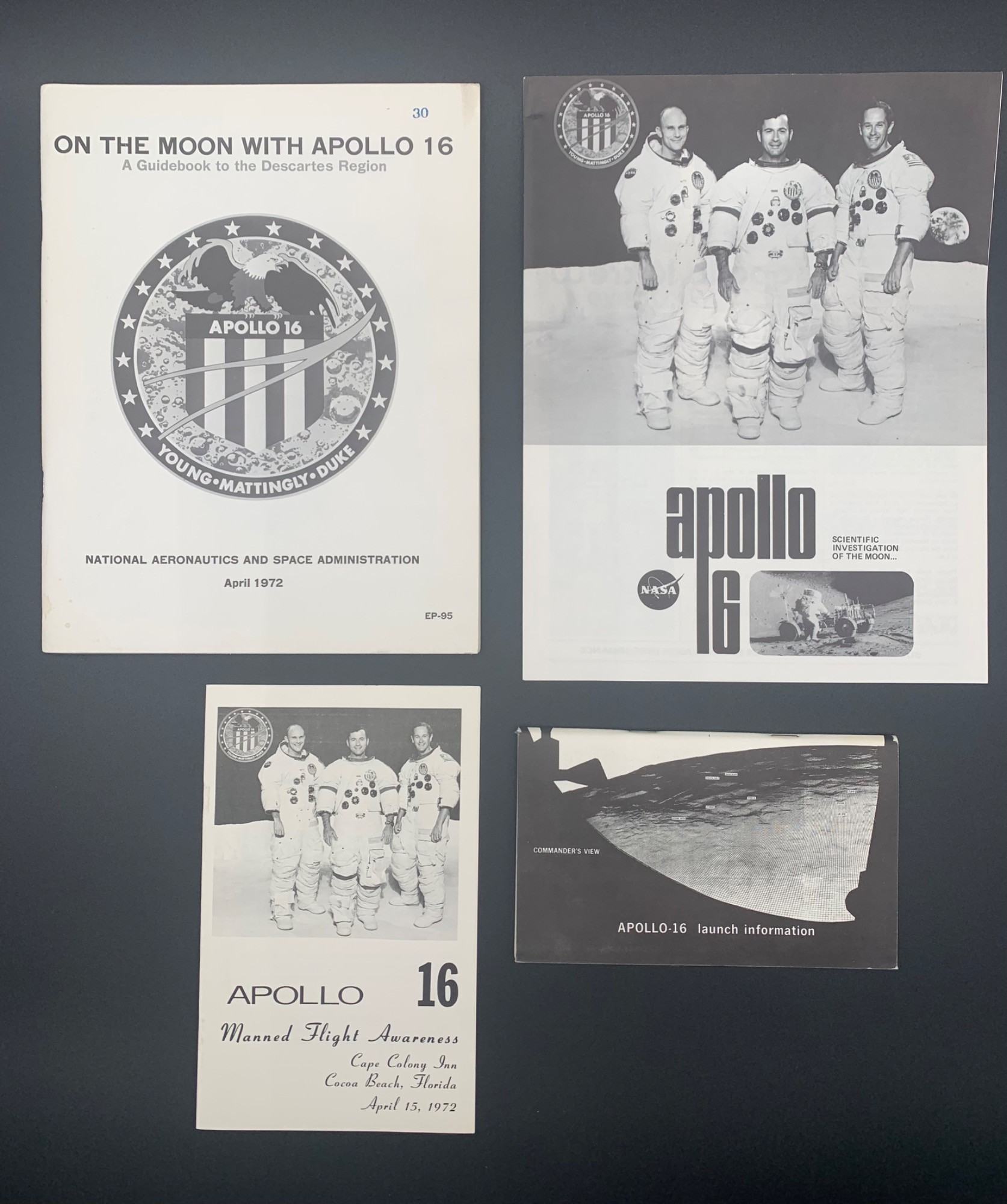 4 black & white publications directly connected to the Apollo 16 mission (1972). All in great shape. APOLLO 16 SCIENTIFIC INVESTIGATION ON THE MOON - booklet on part of the Manned Flight Awareness program out of Huntsville - PM-SS. Details crew, schedule of events, mission objectives, lunar roving vehicle details, general lunar data & landing site as well as Apollo 16 vehicle characteristics, the back-up crew, and overview of previous Apollo missions. 12 printed pages. ON THE MOON WITH APOLLO 16 - A GUIDEBOOK TO THE DESCARTES REGION by Gene Simmons. Softcover with staples, April 1972, NASA EP-95 (Washington DC) 90 pages. Includes landing site description, science activities on the surface (seismic experiments, cosmic ray detections, etc.), orbital science activities (x-ray fluorescence, mass spectrometer experiment, etc.) and crew information. Also includes numerous tables.. APOLLO 16 LAUNCH INFORMATION FROM MCDONNELL DOUGLAS ASTRONAUTICS. Softcover with staples. No publication date. Very technical booklet containing "AS 511 Launch Information" with schedules, maneuver & restart diagrams, launch chain interlocks, elevations, and event sequences in minute detail. 56 pages. Attendee program from APOLLO 16 FLIGHT AWARENESS AT THE CAPE COLONY INN AT COCOA BEACH (April 15, 1972). This evening honored many of the professionals that made the mission possible along with manufacturers & suppliers as well as Space Center Employees & NASA employees. Pretty much a Who's Who of aerospace industry during the period.