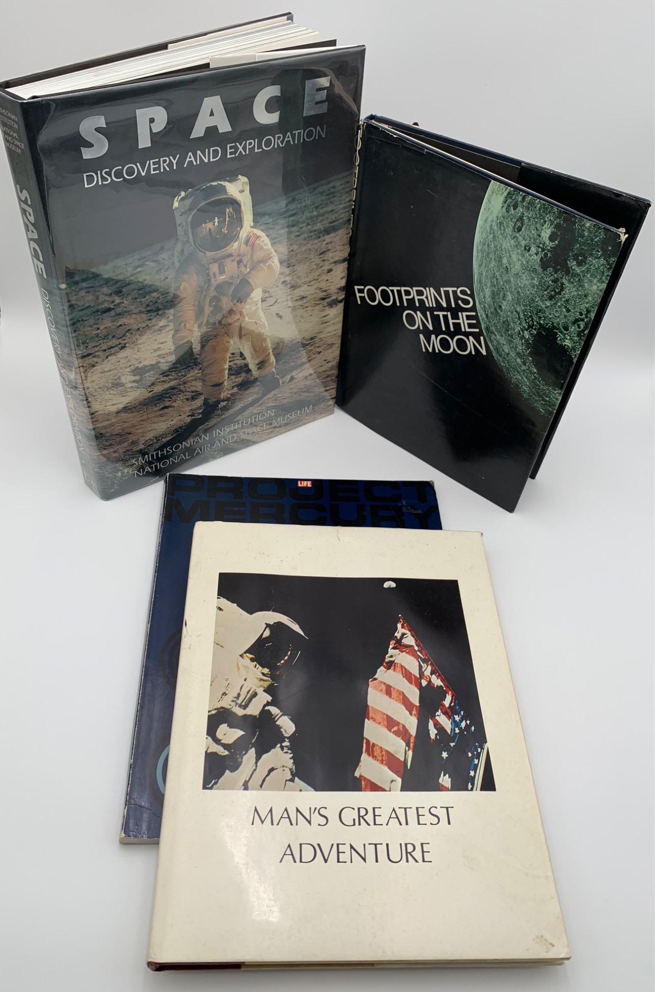 Quartet of books on general space exploration. FOOTPRINTS ON THE MOON by John Barbour & the Associated Press. Hardcover w/dustcover. 1969, Associated Press. 214 pages. Focus is on space race. Used condition with slight damage to dustcover and back lower cover. PROJECT MERCURY from Time-Life. Softcover. 1964, Time-Life & Simon Shuster (New York NY). Up close and personal photos like you would expect from Life Magazine - tells stories of various astronauts with candid photos. No pagination. Used condition. SPACE: DISCOVERY AND EXPLORATION from Smithsonian Air & Space Museum. Hardcover with dustcover/plastic protective jacket. 1993, Hugh Lautner Levin Associates (New York NY). 320 pages. Lots and lots of full-color high quality photos. Excellent condition. MAN'S GREATEST ADVENTURE by Lawrence Allen. Hardcover. 1974, BRM Selah Co. (Selah WA).128 pages. History of the space program. NOTE - the copy you see photographed IS NOT the one you will receive; the copy pictured is to show the inside of the book. You will receive the book still in original shipping box as shown in the last two photos, We believe it to be brand new as the box has not been opened, however. we cannot guarantee the condition given it has been stored for many years. All 4 books are large format - the smallest (Footprints) measures 12" H x 9.5" W. Please see photos to judge condition for yourself.