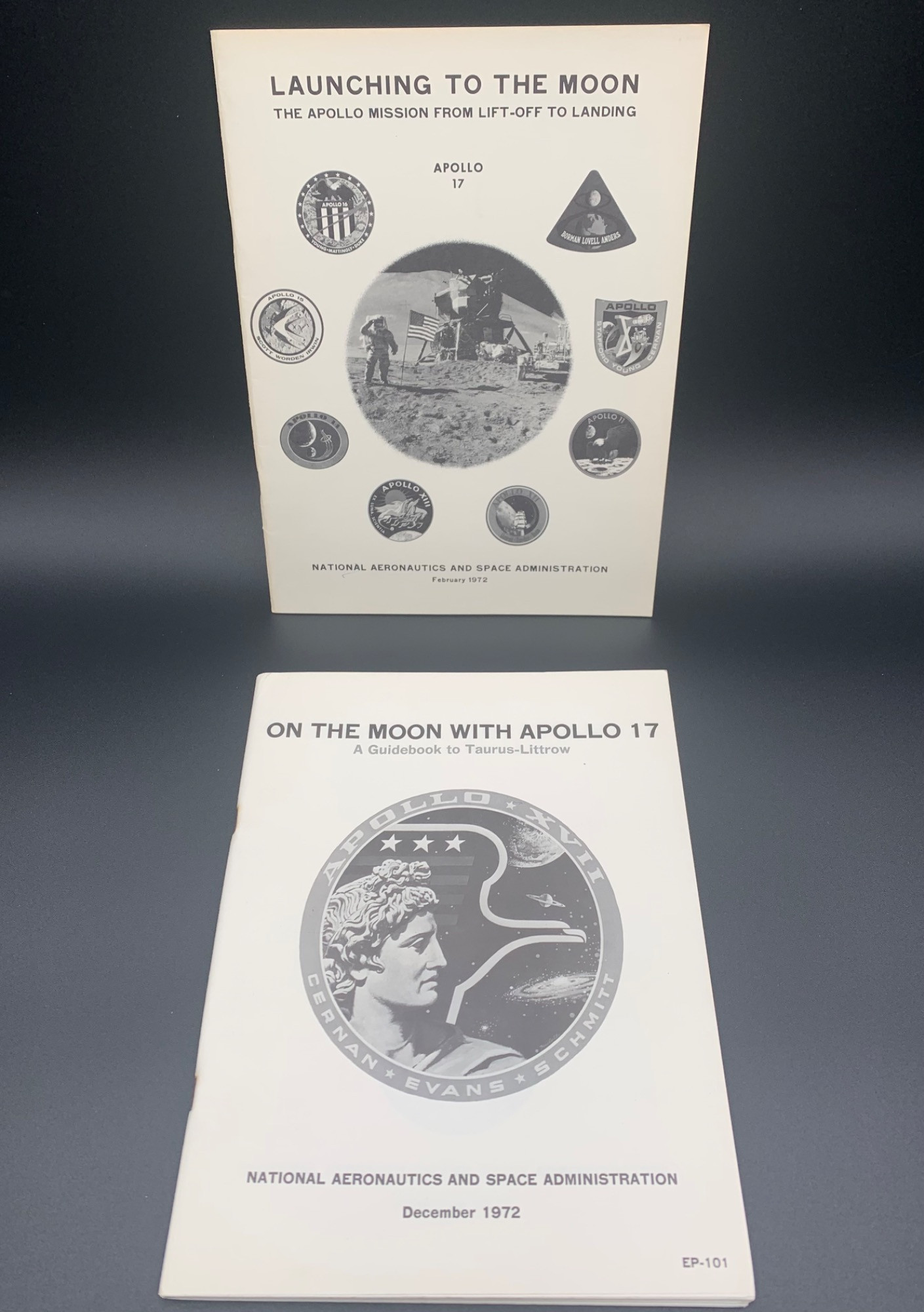 Pair of NASA publications from 1972 about the Apollo 17 Mission. LAUNCHING TO THE MOON - THE APOLLO MISSION FROM LIFT-OFF TO LANDING by John H Boynton. Softcover with staples. February 1972, no NASA Special Publication number (Washington DC). 37 pages. Explains the nuts & bolts of the mission in concise language with clear explanations of physics, timing, and explanations of launch windows. In black & white with several illustrations & glossary. ON THE MOON WITH APOLLO 17 - A GUIDE TO TAURUS-LITROW by Gene Simmons. Softcover with staples. December 1972, NASA EP-101 (Washington DC).111 pages. Also written in for a general audience, but one with a clear interest in science. Details on the lunar rovers, tools used, and technical specifications are covered, but written in a very accessible way for a general audience with some science background. In black & white with numerous illustrations & photos. Both booklets are in excellent condition with no obvious signs of wear or use. They are each bound with two staples that have started to rust, but are still fast. There is one small, barely noticeable pen stroke on the front of the Launch booklet - see last photo.