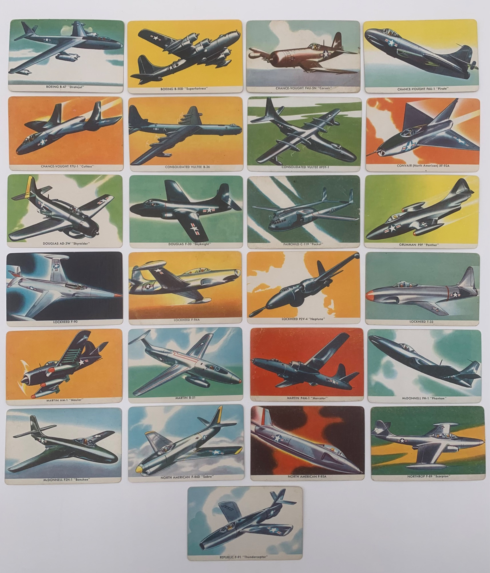 An almost complete set (25 of 27)* of Pack-O-Ten premium Warplane Cards from Quaker Cereals. 1957. Full-color renditions of the various models with artsy backgrounds on the front and info about the model on verso. No numbering on cards. The cards are in very good condition. Measure 2.25" H x 3.5" W. *only two missing are B-49 Flying Wing & B-45 Tornado.