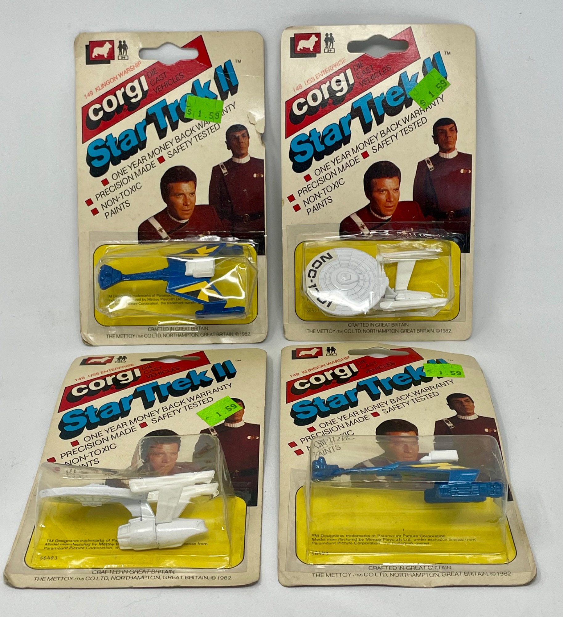Two pairs of Vintage Star Trek spaceships from Corgi - 4 ships total. 1982. Klingon Warship - Model #149. Measures 3" L. USS Enterprise - Model #148 Measures 2.75" L. In original unopened packaging that shows some age/storage wear, but are in good general shape. Please see photos to determine for yourself. Shipping available only through Fed Ex Pack & Ship
