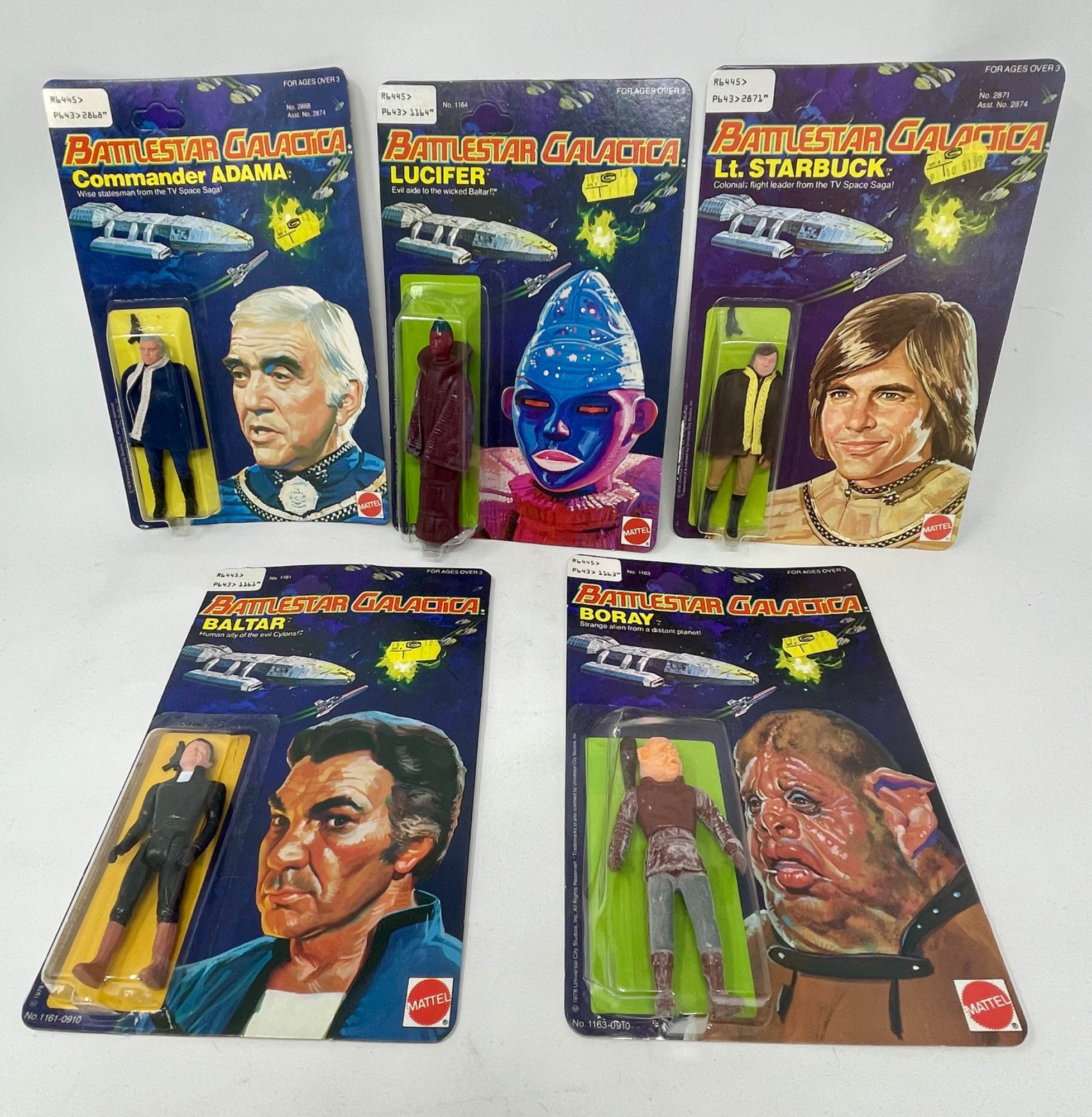 Set of 5 original Battle Star Galactica action figures from the 1970s TV series starring Lorne Green and Dirk Benedict. Authorized by Universal Studios for manufacture by Mattel. 1978. Figures are 3" H. All are in their original packaging with seals intact. Note there is a some storage wear and slight white bloom on plastic/vinyl. See photos for details. Commander Adama (“The Wise Statesman") Model #2868 Lucifer ("Evil Aid to the Wicked Baltar) Model #1164 Packaging was misaligned during manufacture - see photo. Lieutenant Starbuck (“Flight Leader”) Model #2871 Boray ("Strange Alien from a Distant Planet") Model #1163 Baltar ("Human Ally of the Evil Cylons") Model #1161 Shipping available only through Fed Ex Pack & Ship