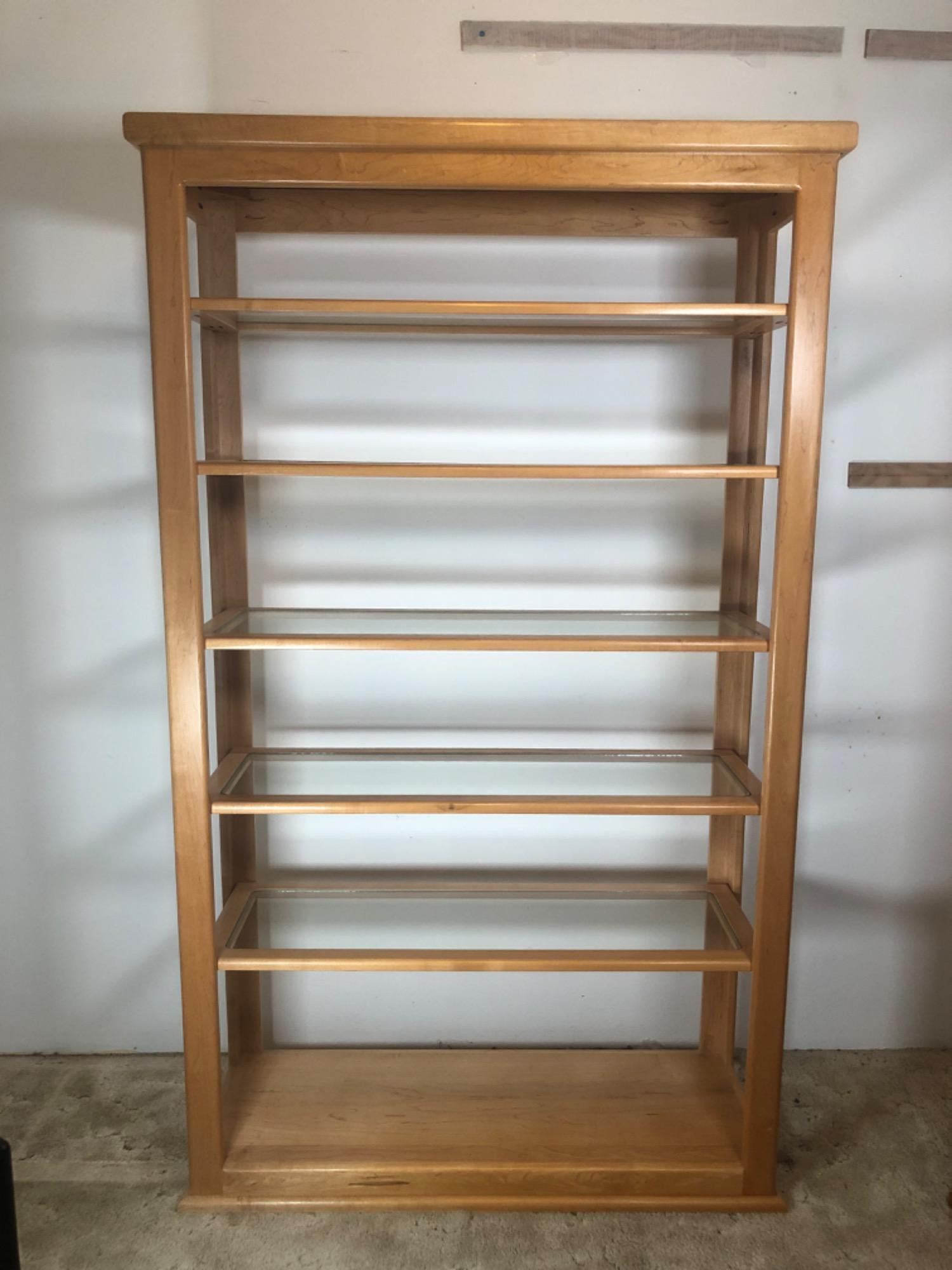 Sturdy Blond Oak Display Unit - 5 Shelves Includes 5 glass shelves that are framed and supported by oak trim. Each shelf is adjustable. Very impressive display unit with smooth, fine furniture finish. Was used to display pottery collection. Dimensions 73 Inches High by 42 Inches Wide by 15 Inches Deep Bidding on this lot is an agreement that: (1.) You