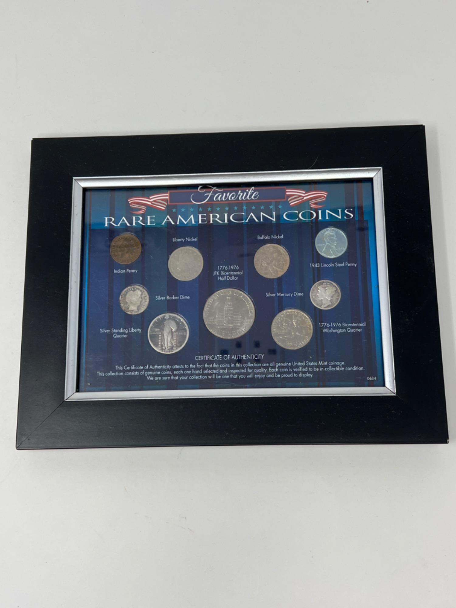 A set of U.S.A. favorite rare coins that include 1943 Lincoln Steel Penny, Silver Barber Dime, Liberty Nickel, Indian Penny, Buffalo Nickel, Silver Mercury Dime, JFK Bicentennial Half Dollar, Standing Liberty Quarter. Bicentennial Washington Quarter, and Liberty Nickel. Set has been stored in a glass covered frame. We removed the back of frame so you could view the obverse/reverse sides of the coins.