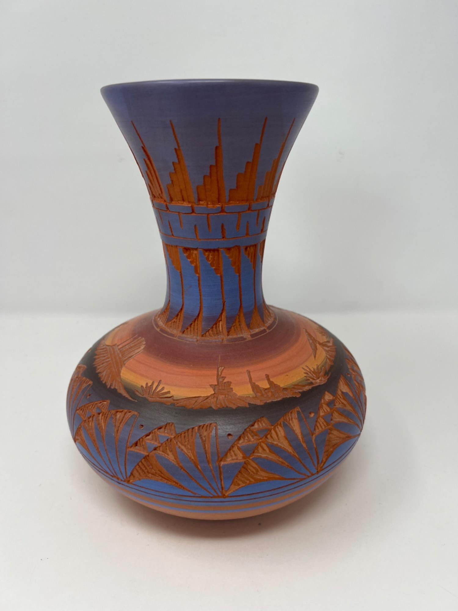 Red Earth pottery vase original artist, Reifina Rockwell (?), Cortez, Colorado, Mesa Verde Pottery. Purchased in 2002, Ruby’s Inn Store, Bryce Canyon, Utah. Size: 9” tall x 7” diameter widest area, 4” top opening.