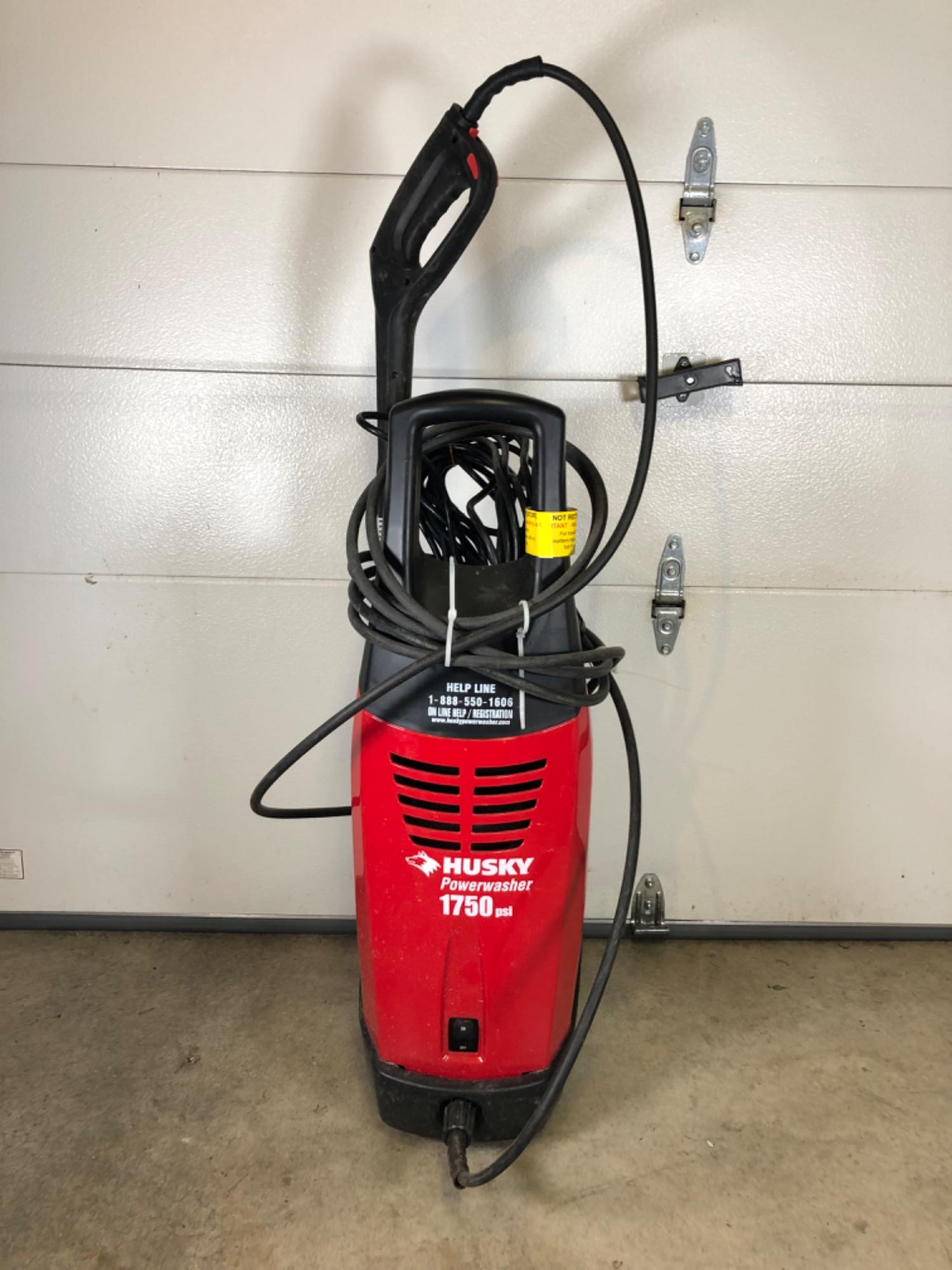 The Husky 1750 PSI Power Washer is a cold water corded electric pressure washer. It has features that include on-board accessory storage, integrated carry handle; a green light that indicates that the power washer is ready to use; an easy grip gun trigger to start the motor. Lightly used and in working condition.