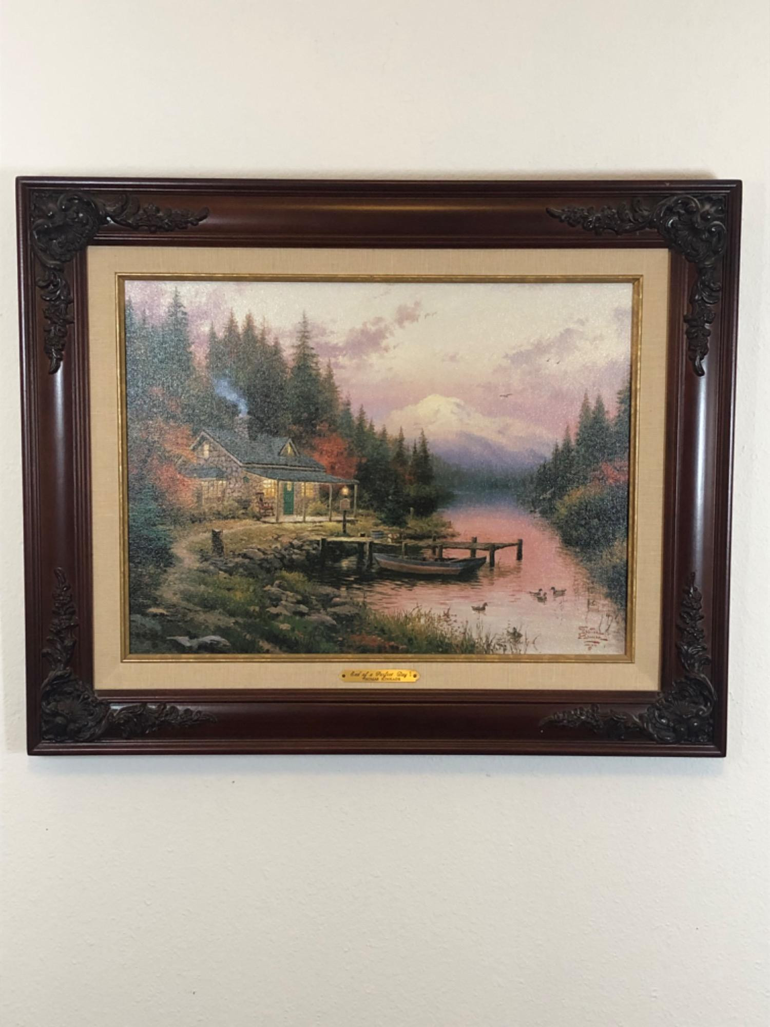 Framed Thomas Kinkade Lithograph, Edition 1 and number 1997. Titled "The End of a Perfect Day" Certificate of Authenticity included on the back of frame. Dimensions (including frame): 18"H x 21.5"W x 1"D