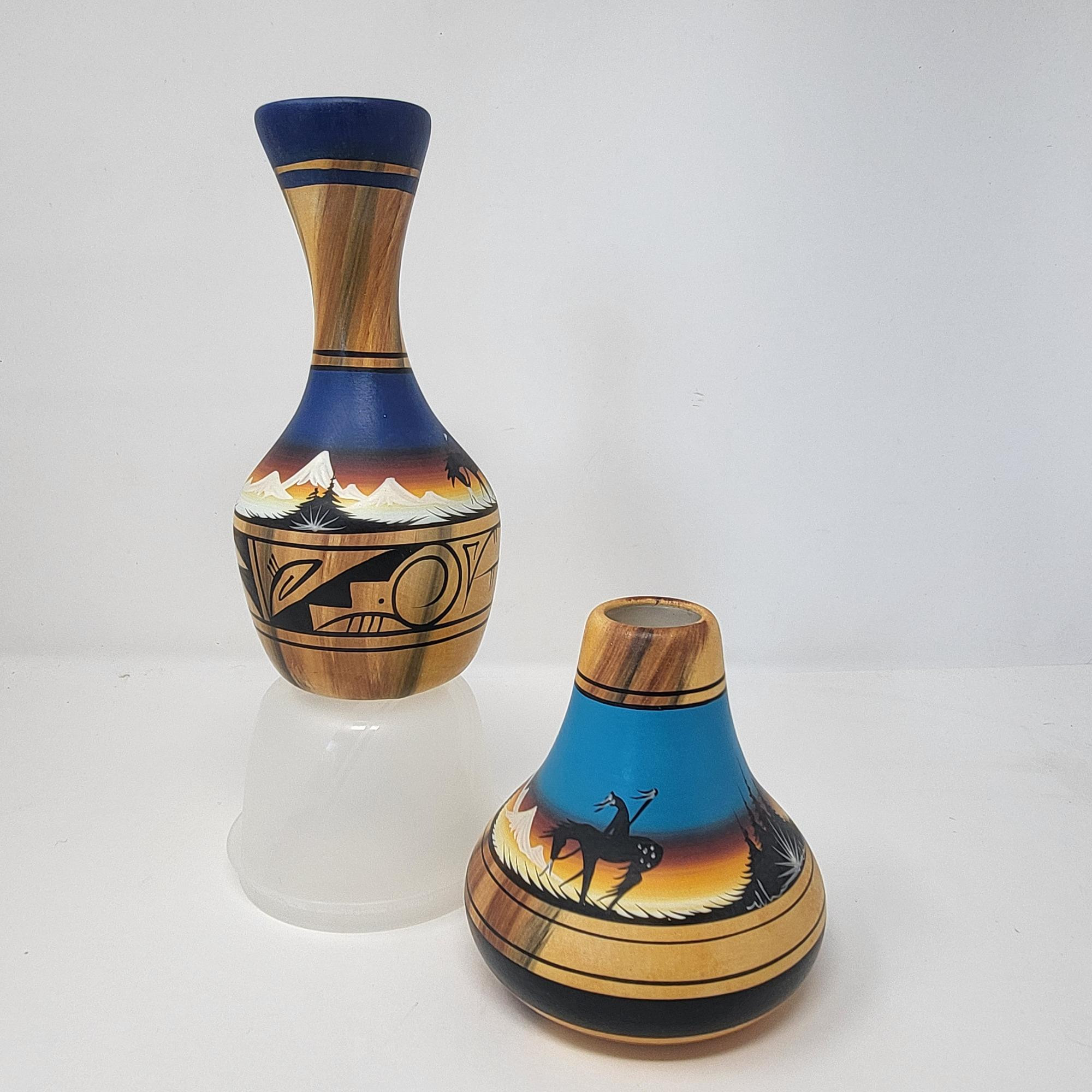 Signed Dwayne Blackhorse, two hand painted Navajo vases 8.25" T x 4" W and 5.5" T x 5" W (at widest).
