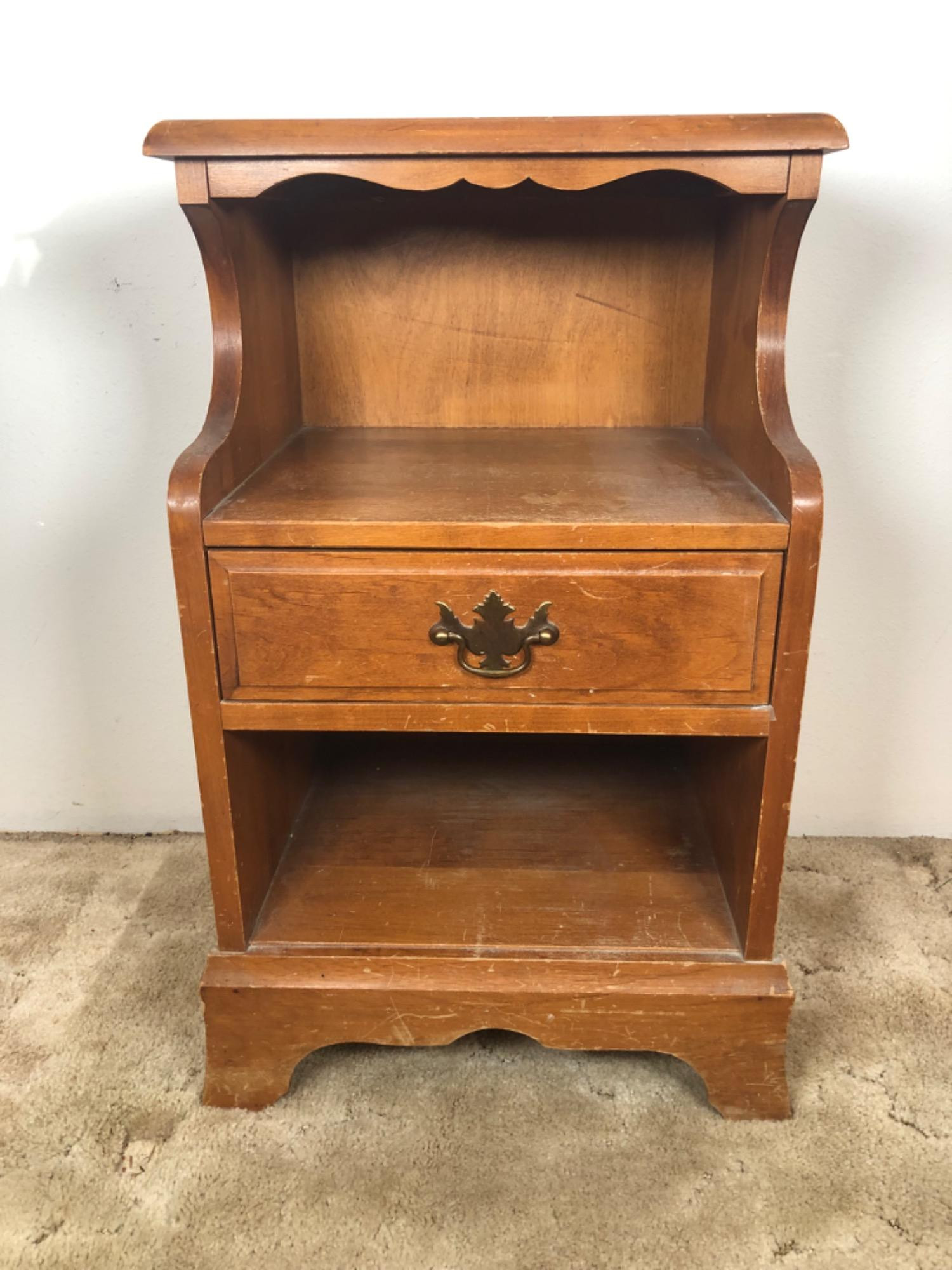 Vintage Solid Wood Small End Table Nightstand Made by Sterling Furniture Measures: 26 h x 16 w x 12.5"d Finish needs a revamp