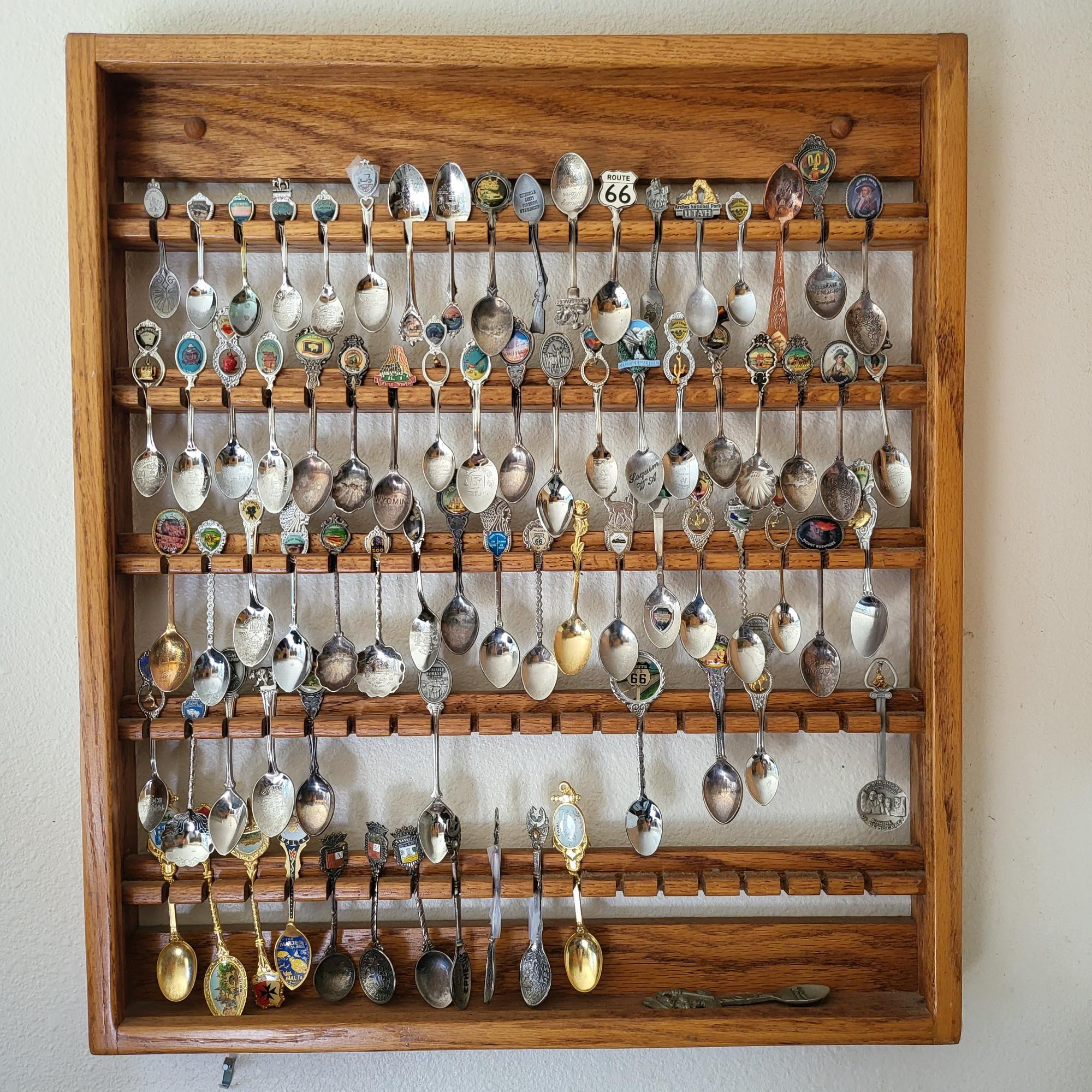 Different states, Disney and other tourist hit spots souvenir spoons. Silverplate, pewter, gold plated. 76 spoons nestled in a display wood box 21" W x 24" T x 2.5" D.