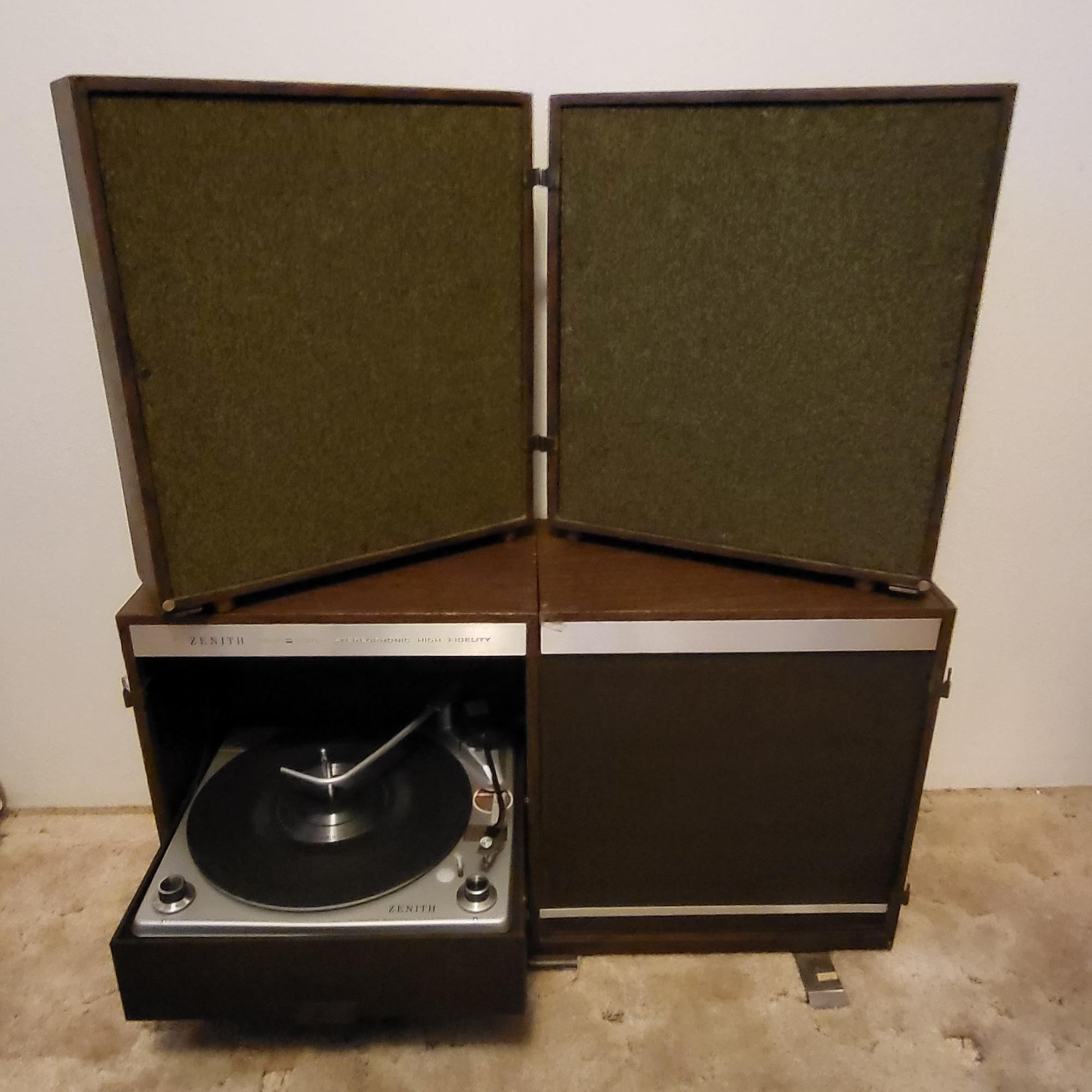 Zenith. Removable speakers. Heavy stereo/record player and radio cabinet. Overall measurements are 30 x 13 x 6.5. One side (left) has a drop down turntable; the right side top lifts to reveal the radio. Operating Guide included. It is not working but may with the right love given to it. It's just a neat stereo cabinet. It is quite heavy, so two (2) people to load is recommended.