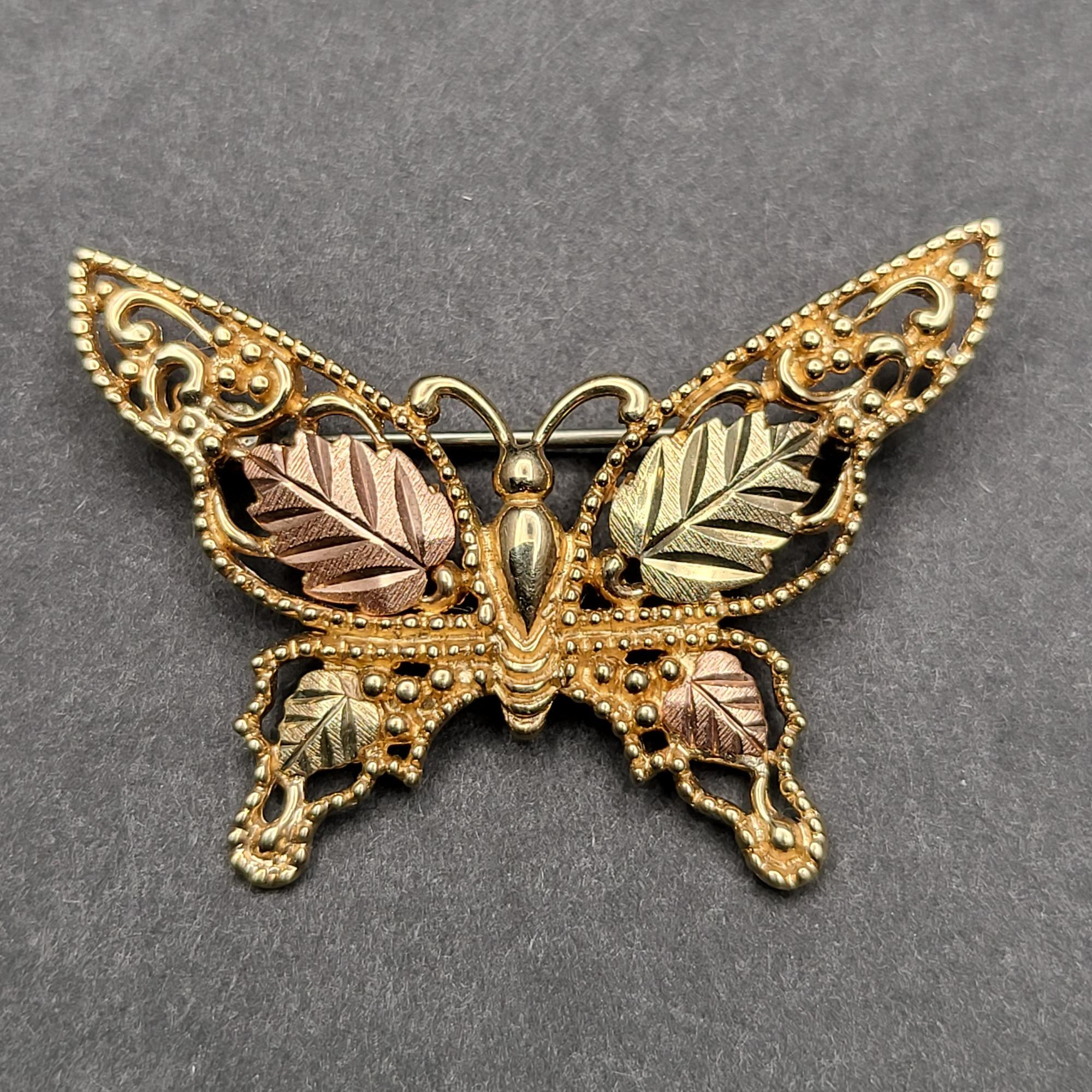 Black Hills Gold tricolor butterfly brooch measures 1.75" long and 1.5" tall. Beautiful, grape leaves design with in the butterfly. It is stamped 10k. Very pretty piece, weighing a little over 5 grams.