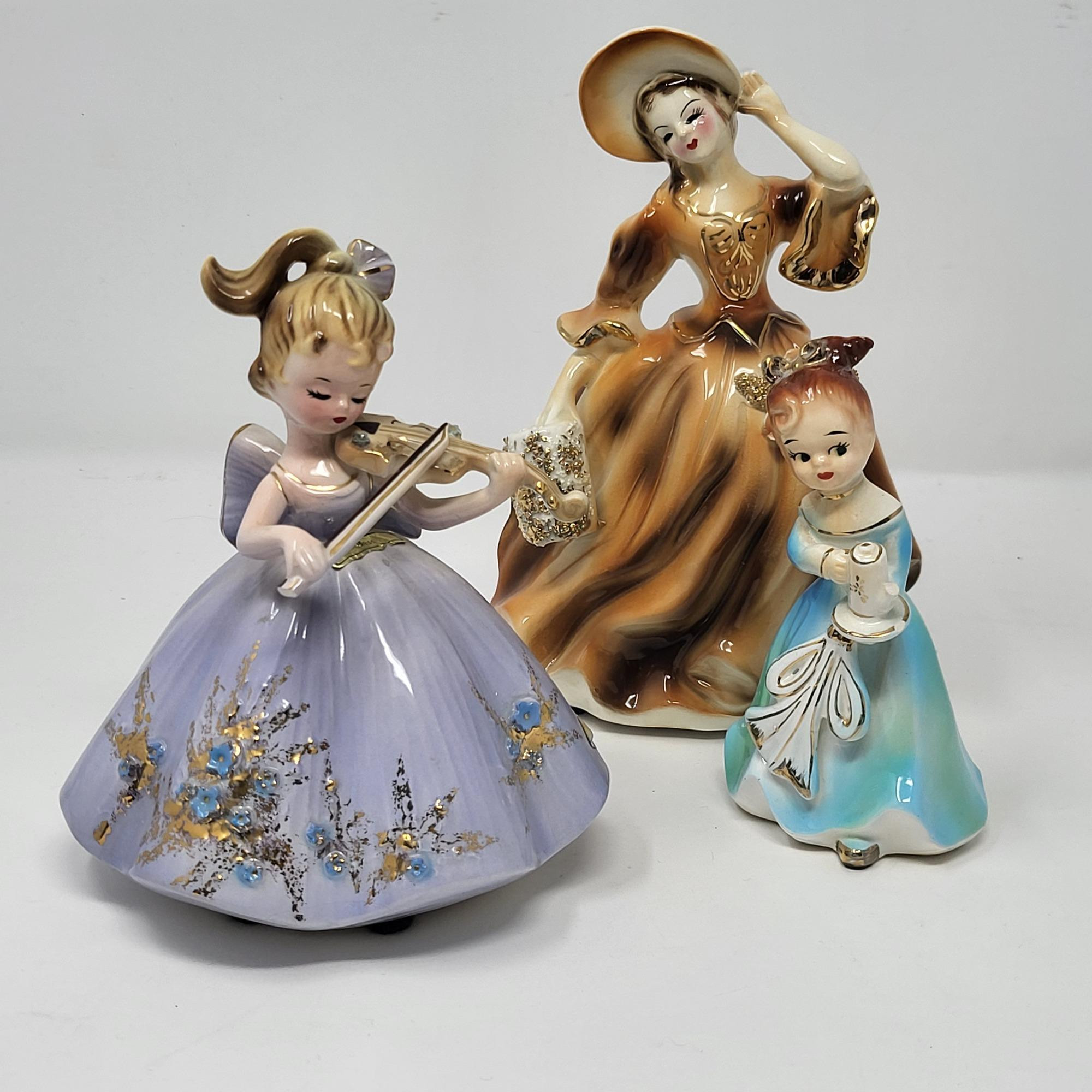 Three Mid-Century figurines. 5" young girl holding tea pot, wearing blue dress and hair in a bow. Made in Japan. 8.5" brown dressed woman wearing hat, unmarked but possibly Joseph Originals? Bess is a darling Violin player, Joseph Originals (bow broken at bottom) but still quite a lovely piece.