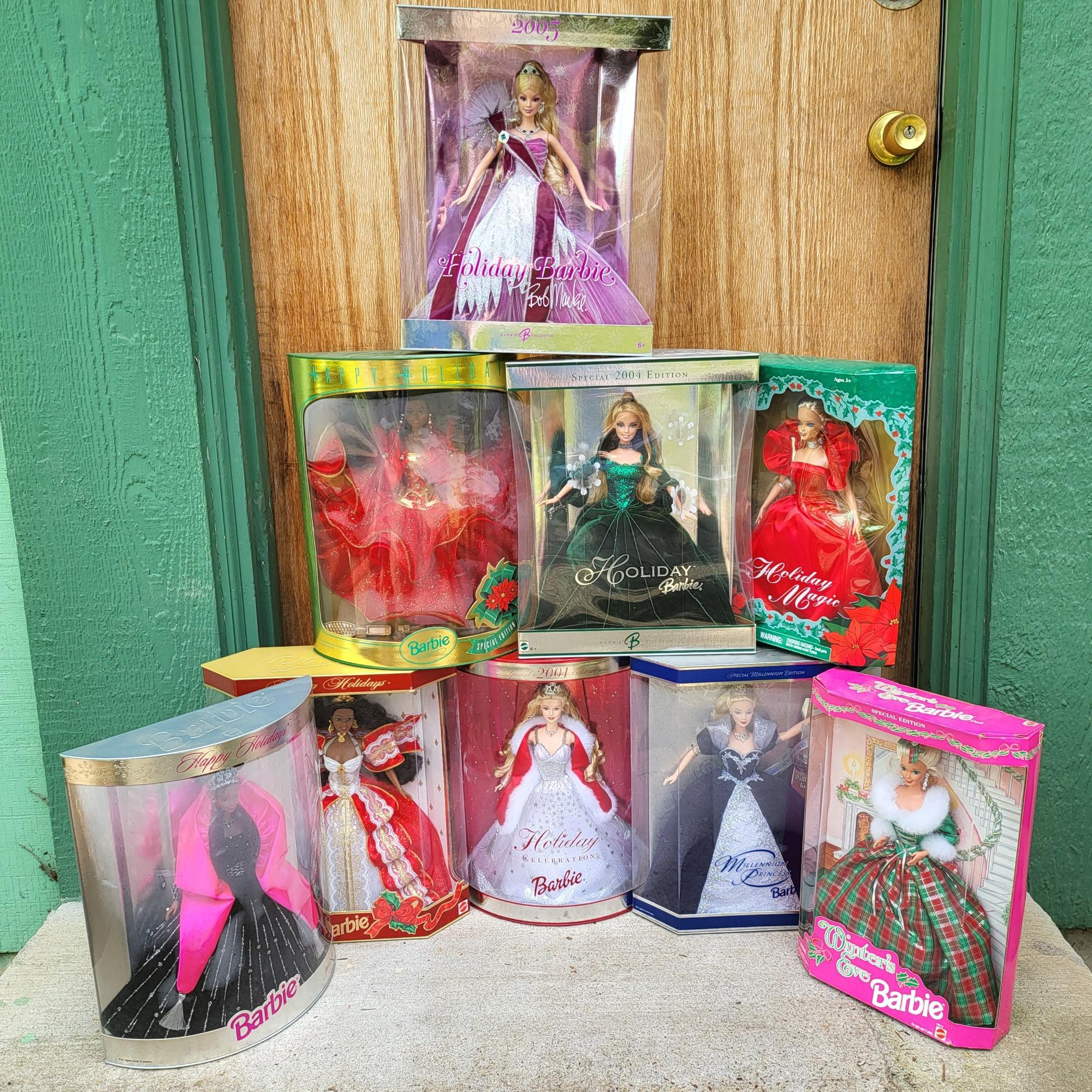 Nine various years, Holiday Barbie's in Boxes. All are wearing the holiday's most extravagant gowns.