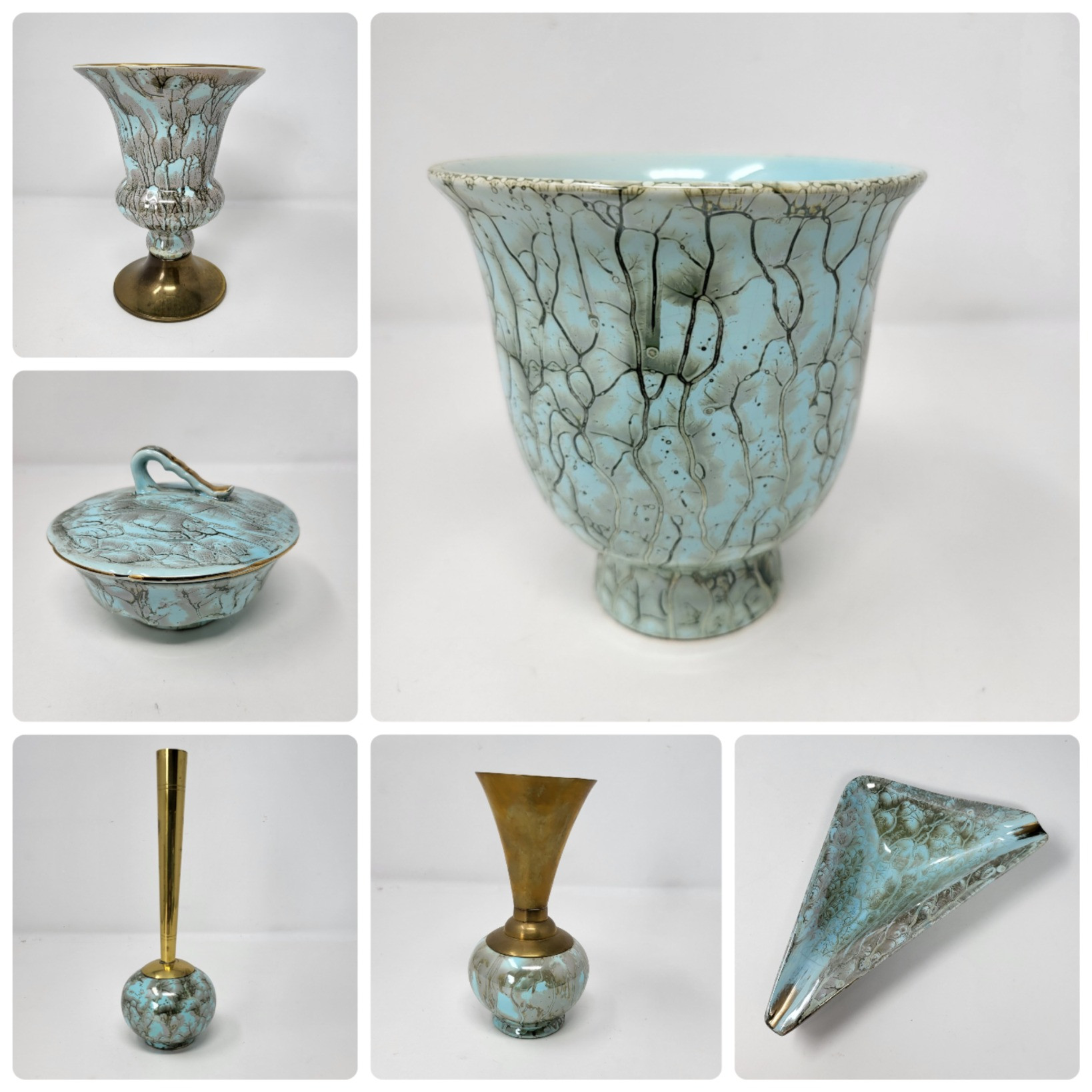 Mid-Century, Hand painted, Delft Holland, turquoise & smokey color with brass. Urn style vase 7.5" x 7.75" Vase 4.75 x 4.5" Covered dish 5" x 2" Tall Vase 8.75" Shorter Vase 5.75" Ashtray 9" x 4.5"