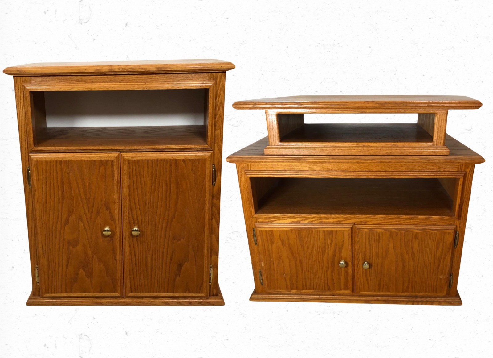 Wood TV Stand and Media Cabinets. TV stand has an upper shelf for an electronic device and lower cabinet with storage capability (one middle shelf). The tiered top section removes so it can be used as a one level side table as well. The media cabinet has an upper shelf for storage and a lower closed cabinet (with one shelf). Dimensions: TV Stand with Cabinet - 28 Inches High by 32 Inches Wide by 19.5 Inches Deep Media Cabinet - 30 Inches High by 25 Inches Wide by 13 Inches Deep