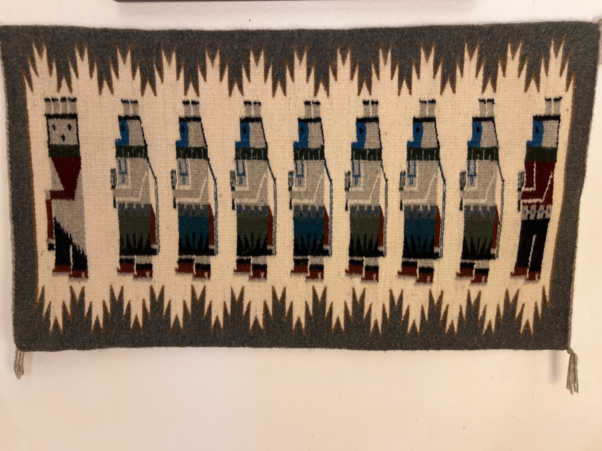 Southwest Native American Yei rugs are woven with a pictorial of the masked human dancer participating in the actual healing ceremony and embodying the Yei. Yei-be-chai rug portrays a line of dancers, usually shown from the side and often with one foot raised as though in a synchronized dancing motion. The medicine man and “Talking God” often lead the way, and a clown is often shown at the end of the line. This rug is 100% wool and woven by Navajo artist, Vivian Blue Eyes, of Noteh Dine, Cortez, Colorado. Purchased September 2002. No. 4