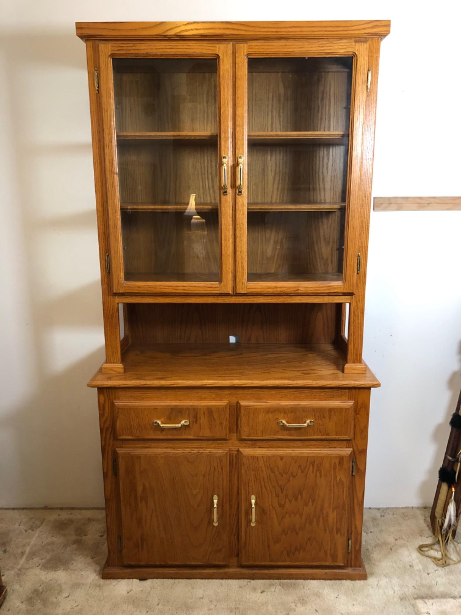 Wood Display Cabinet with Drawers Upper section of cabinet has 3 shelves with 2 of the shelves adjustable Middle section has 2 drawers Lower section is a cabinet with doors and an adjustable shelf Dimensions: 73 Inches High by 38 Inches Wide by 16.5 Inches Deep Bidding on this lot is an agreement that: (1.) You