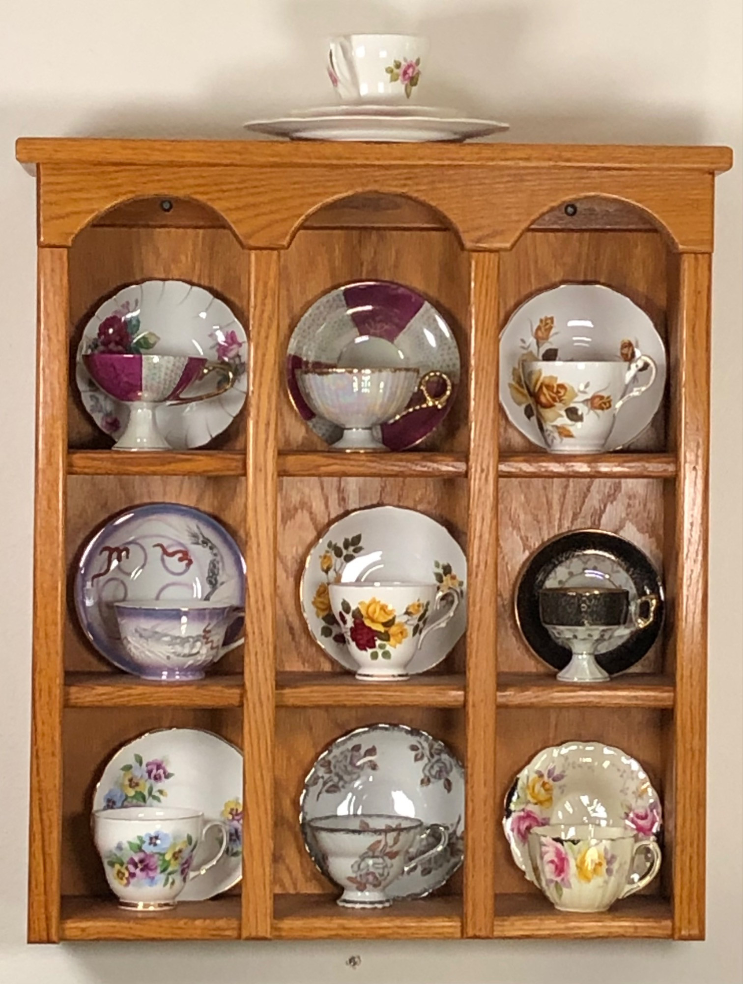 Hand Crafted Oak Shelf filled with Teacups and Saucers Beautiful Hand Crafted Oak Shelving. Shelf was hand crafted by a family member was was a craftsman woodworker and built this beautiful shelve. Unique design as builder had a great eye for details Inside (and an top) are 10 beautiful teacups with their matching saucers Shelf Dimensions: 24 Inches High by 20.5 Inches Wide by 5.5 Inches Deep